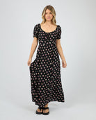 The Vienna Maxi Dress exudes timeless romance, featuring a flowing black silhouette adorned with a soft ditsy pink floral print. Designed with subtle feminine details and a flattering fit, it’s perfect for golden hour strolls or garden parties. Pair it with espadrilles for an effortlessly elegant spring look with a touch of European charm.