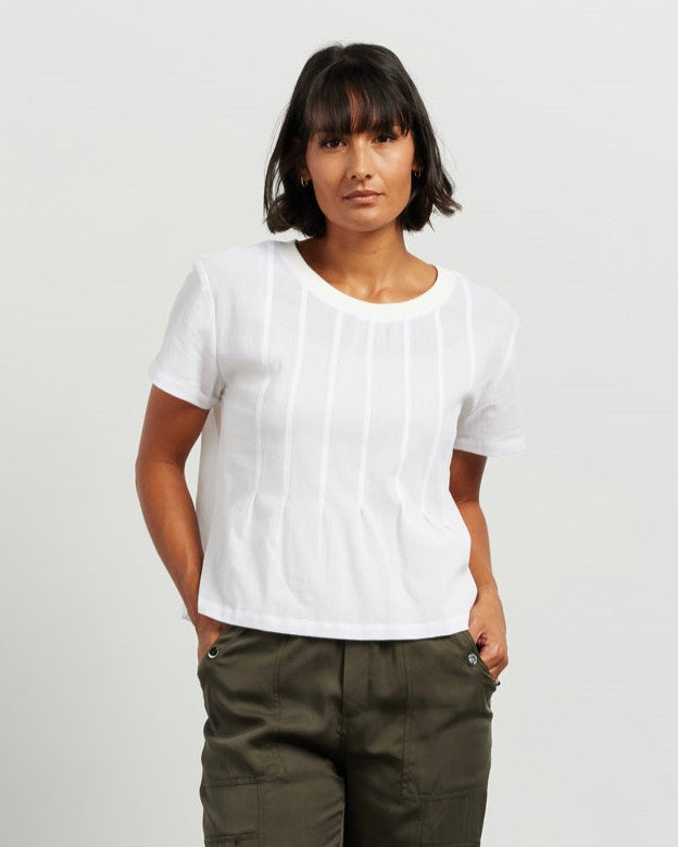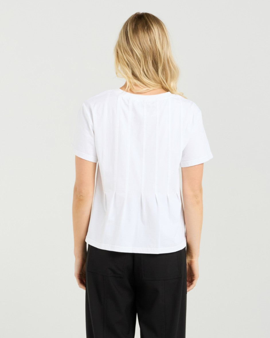 Fabricated in a modal blend, this elevated tee shape is the perfect white tee to add to your collection. With a round neck, flattering sleeve length and front darting detail the Ari top is perfectly paired with a skirt, shorts or your favourite denim for a chic casual look.