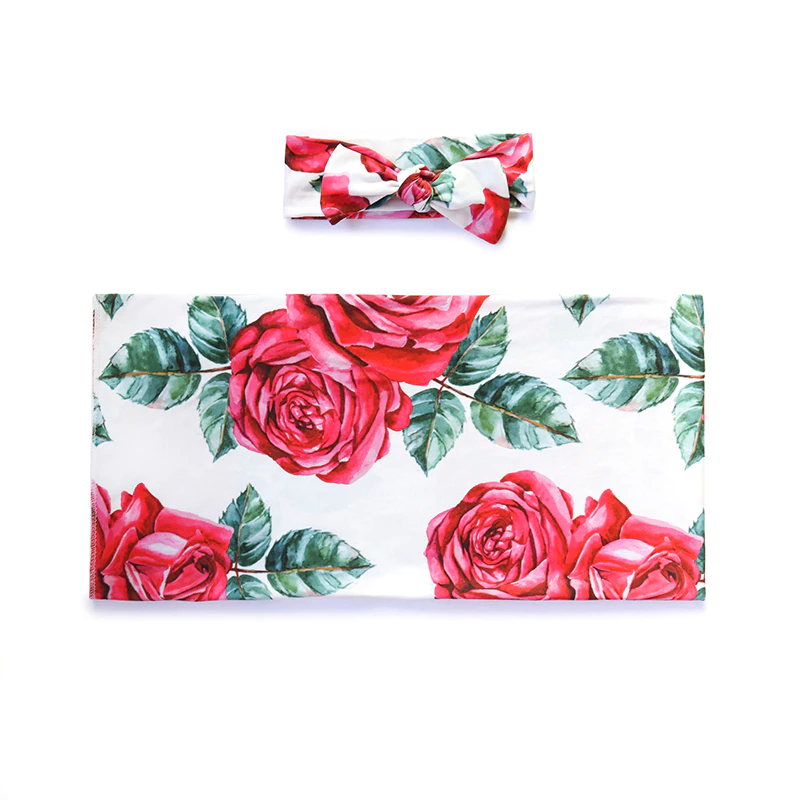 Fresh Baby Jersey Swaddle + Headband set Red Rose