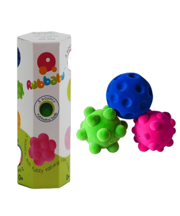 Three textured tactile balls in bright colors and shapes that are fun to hold, rub and squeeze. These soothing and sensory balls are great as fidget toys, stress balls, or just to play with. They have the signature Rubbabu velvety feel.