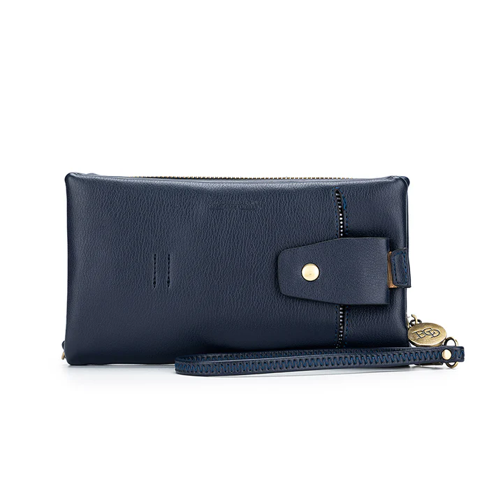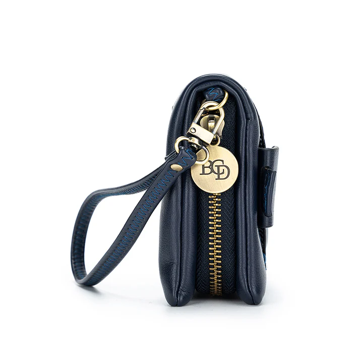- Internal Features: 12 credit card slots, multiple coin/cash compartments. Includes a wrist and cross body strap for easy styling.