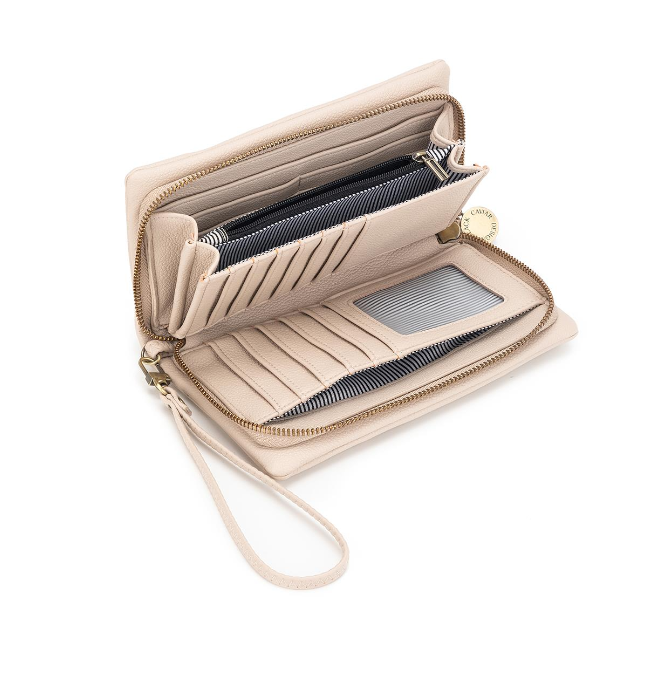 - Internal Features: 12 credit card slots, multiple coin/cash compartments. Includes a wrist and cross body strap for easy styling.