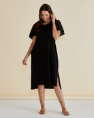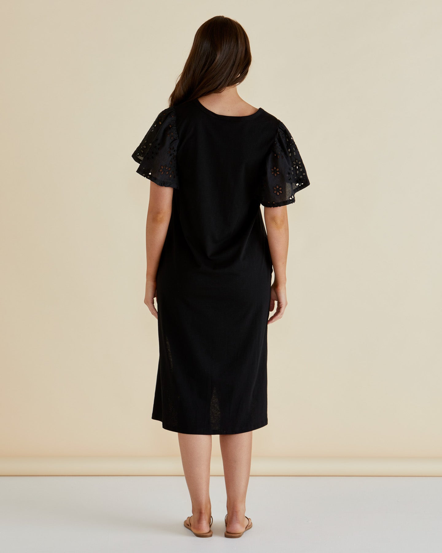 Crafted from cotton jersey, the Sawyer Embroidered Dress blends classic style with playful details. Its scoop neckline, short flutter Broderie anglaise sleeves, and side splits create an elevated silhouette. Relaxed fit and comfortable fabric make it an effortless transeasonal essential.