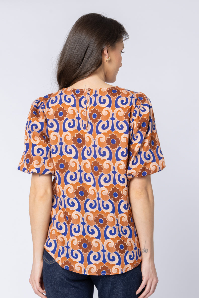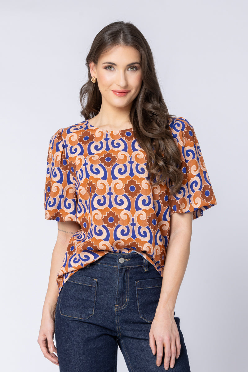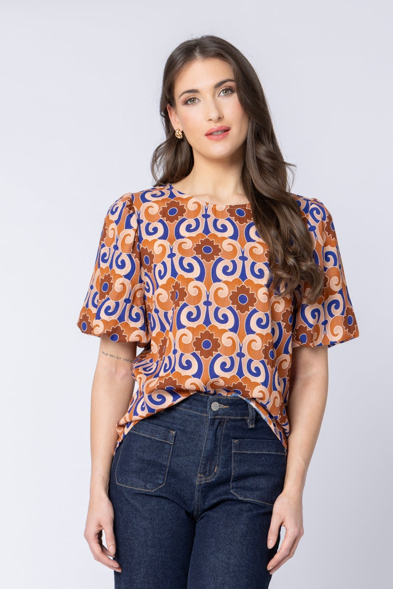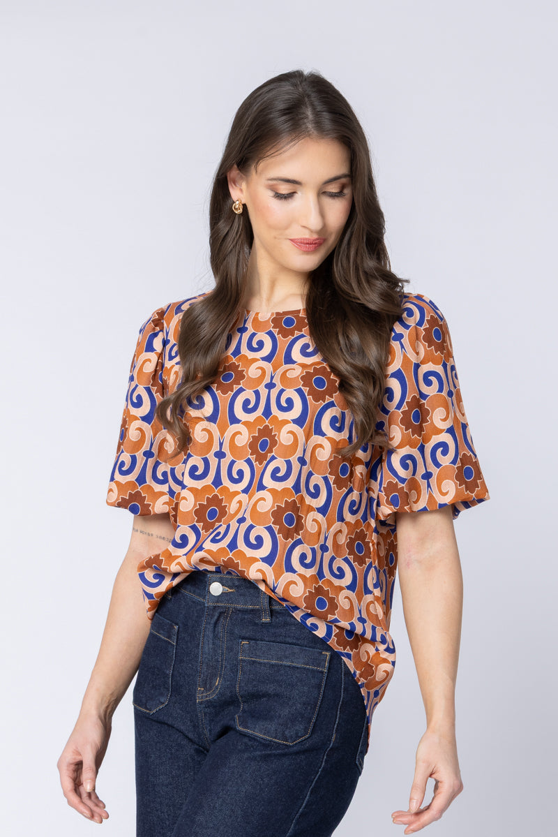 Step out in style with the captivating Seeking Lola Knowing Top in the rich Maple print. This top is a celebration of bold, geometric patterns reminiscent of the 70s, brought to life in a beautiful combination of warm terracotta/maple, earthy brown, and vibrant cobalt blue.