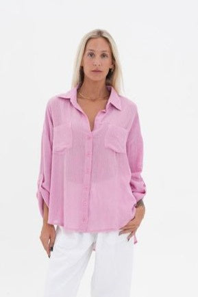 Elevate your wardrobe with the Carmen Striped Shirt in Powder Pink. Featuring practical front patch pockets and a stylish collared v-neckline, this button-up shirt blends function with fashion.