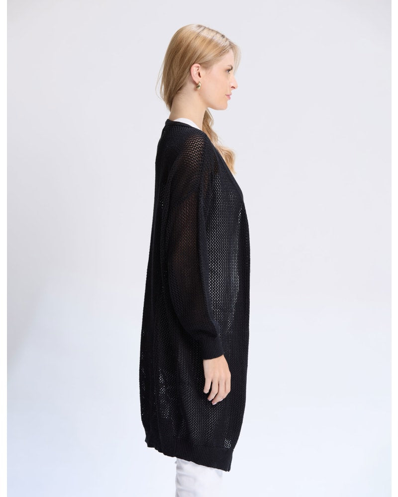 Crafted from a lightweight blend of 55% Acrylic and 45% Cotton, this cardigan features a beautiful open waffle knit that adds texture and visual interest. The ribbed cuffs and hem provide a neat finish, while the knee-length silhouette drapes elegantly, creating a flattering and flowy look.