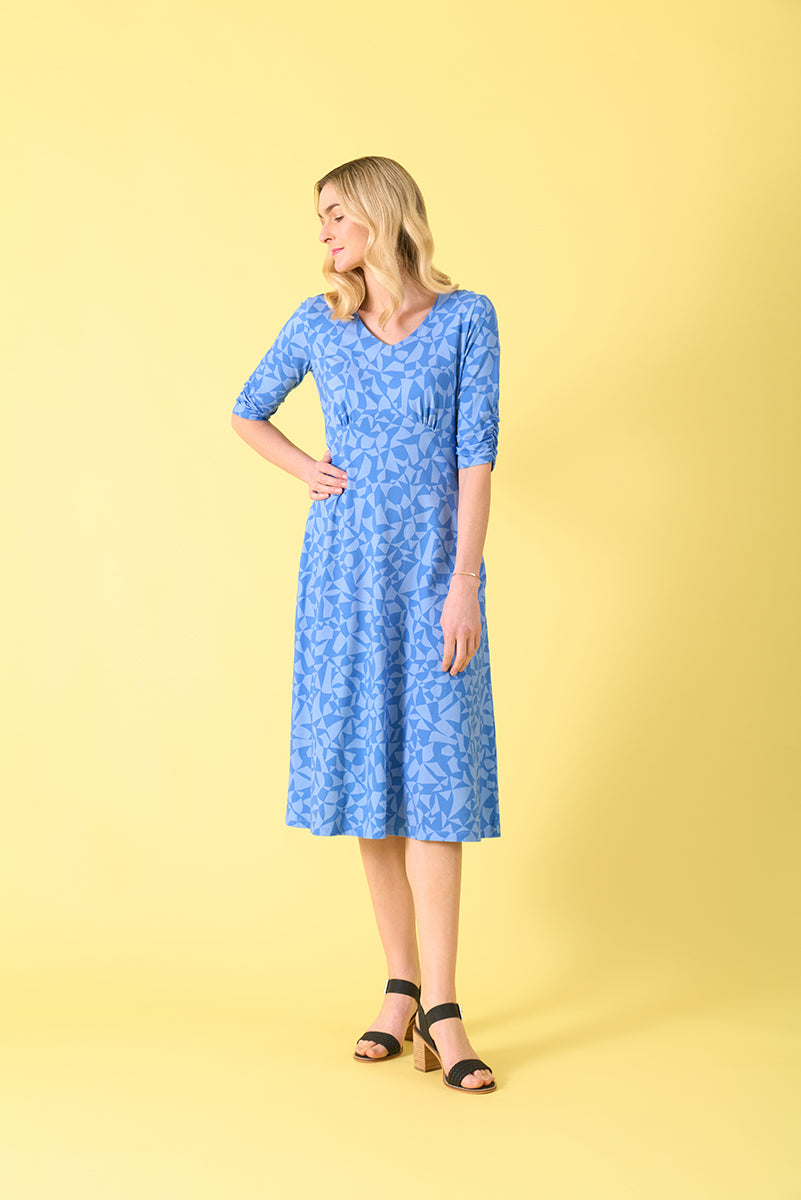 Crafted from a soft and stretchy blend of 95% Cotton and 5% Elastane, this dress is comfortable to wear all day long. The tailored bodice with pleated detail cinches at the waist to create a defined silhouette, while the A-line skirt flows beautifully to a midi length. The unique geometric print in shades of blue adds a modern and eye-catching element to the design.