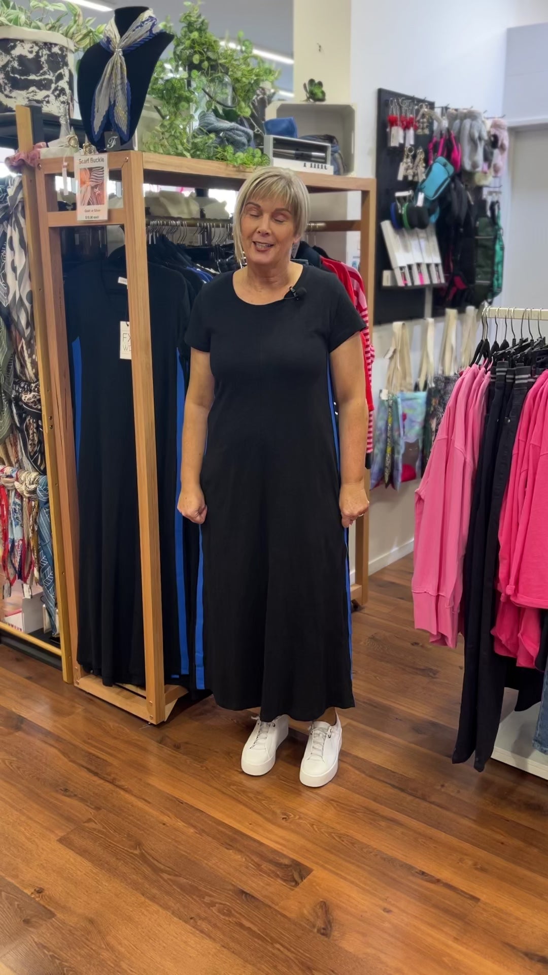 Introducing the Recovery Dress in Black and Blue - a stylish and versatile addition to any wardrobe. With cap sleeves and an aline cut, this dress is both comfortable and flattering. The blue side stripes add a touch of elegance. Perfect for any occasion, this dress is a must-have for any fashion-forward individual
