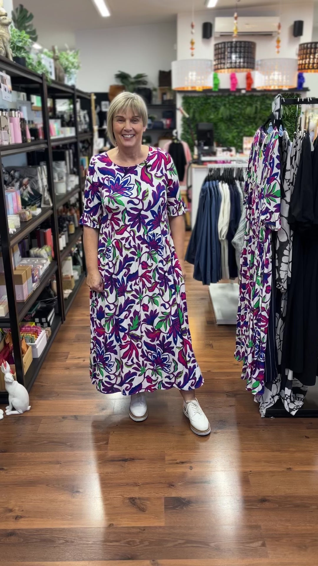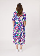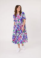 The dress features a bold floral print in a beautiful palette of shades, including electric blue, lively green, deep purple, and vibrant fuchsia. Crafted from a silky crepe blend of 52% Rayon and 48% Viscose, the fabric drapes elegantly, offering a luxurious feel and a comfortable fit.