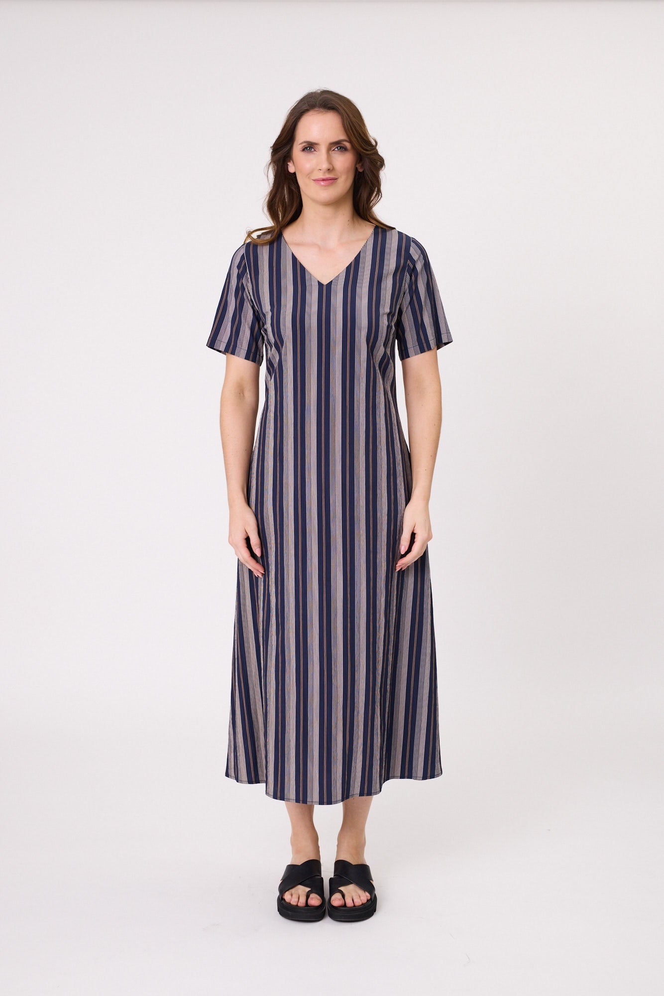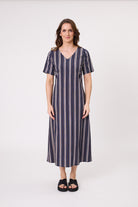 The Marta Dress features an elegant vertical stripe pattern in nautical white and mocha set against a deep navy background. This combination creates a striking, slimming effect and offers versatility for pairing with neutral accessories.