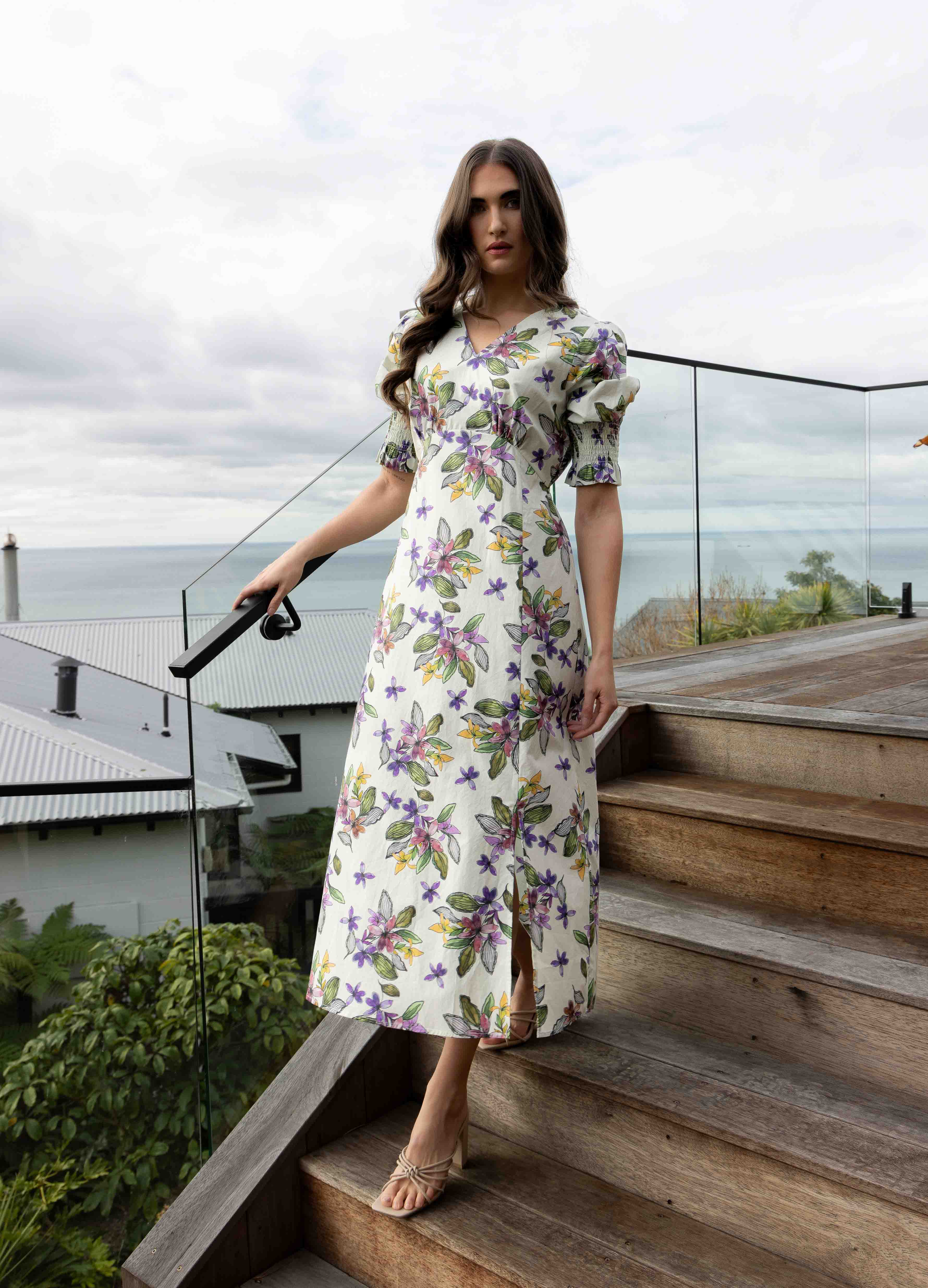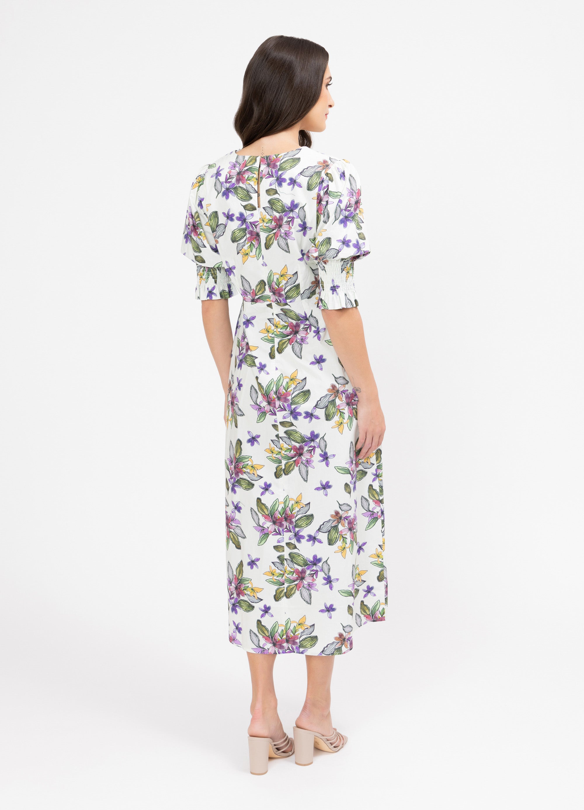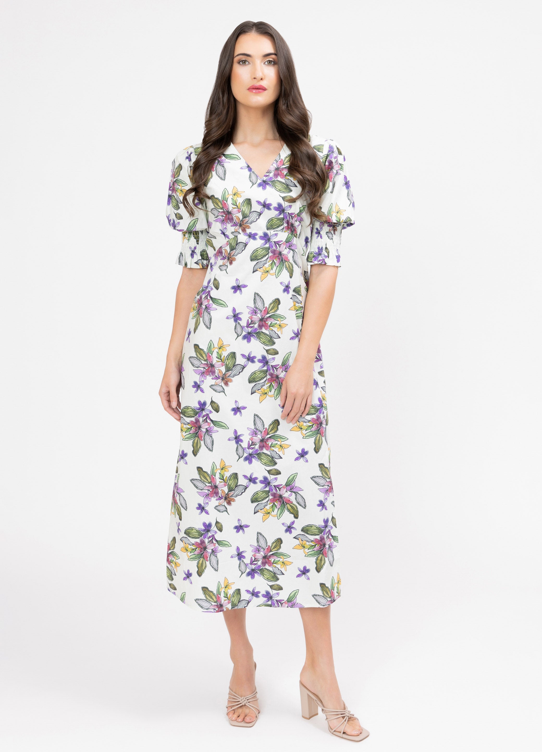 Step into effortless elegance with our stunning white floral print midi dress, designed to make you feel beautiful and confident on any occasion. This enchanting piece features a flattering V-neckline and 3/4 sleeves adorned with delicate shirring cuff details, adding a touch of sophistication to your look. The invisible back zip and keyhole entry ensure a seamless fit, while the empire line silhouette accentuates your waist for a graceful shape. With a chic front side seam split, this dress offers a playful hint of allure.
