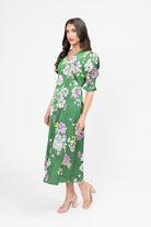 Steal the spotlight in the exquisite Seeking Lola Florence Dress, rendered in a luxurious Kelly Green Satin with a captivating floral print.
