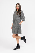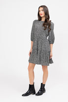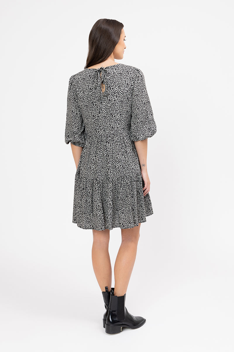 A playful mini dress with a tiered silhouette, leopard pattern, and elbow-length sleeves. Finished with a sweet tie detail at the back neckline, it’s a cute, short, and fun style perfect for casual days or dressed-up outings.