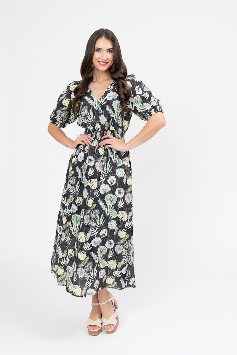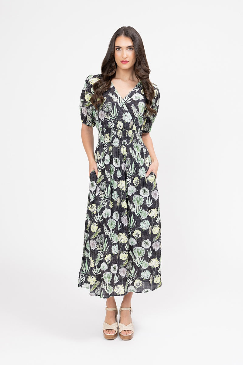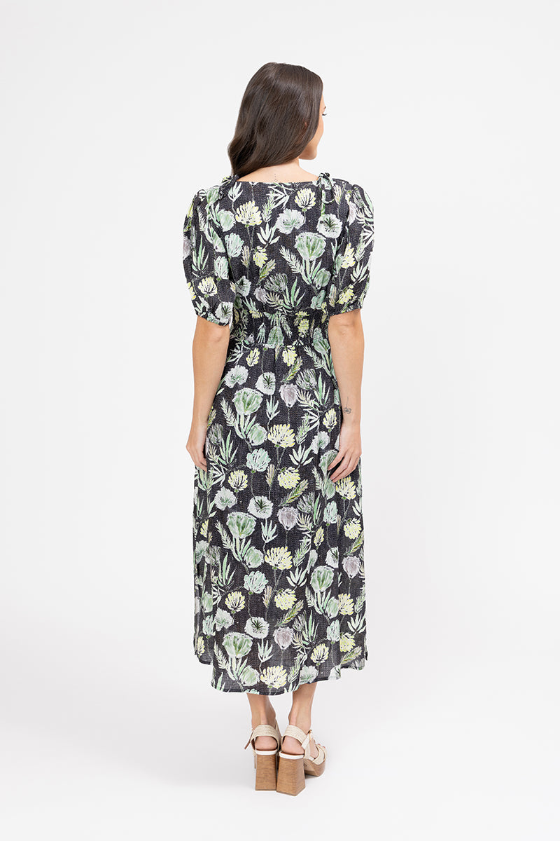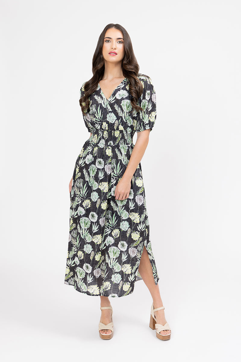 The "Fern Favourite" print features a rich black background adorned with a lush botanical motif of ferns and other foliage in shades of soft green, cream, and pale yellow. The dress has a flattering V-neckline, short puff sleeves, and a shirred bodice that beautifully cinches the waist for a defined silhouette. The midi-length skirt flows gracefully, with a subtle side slit adding a touch of modern flair and ease of movement.