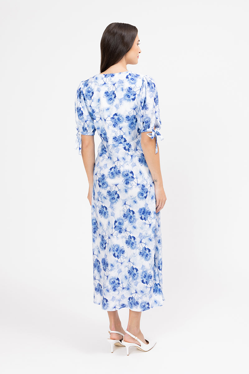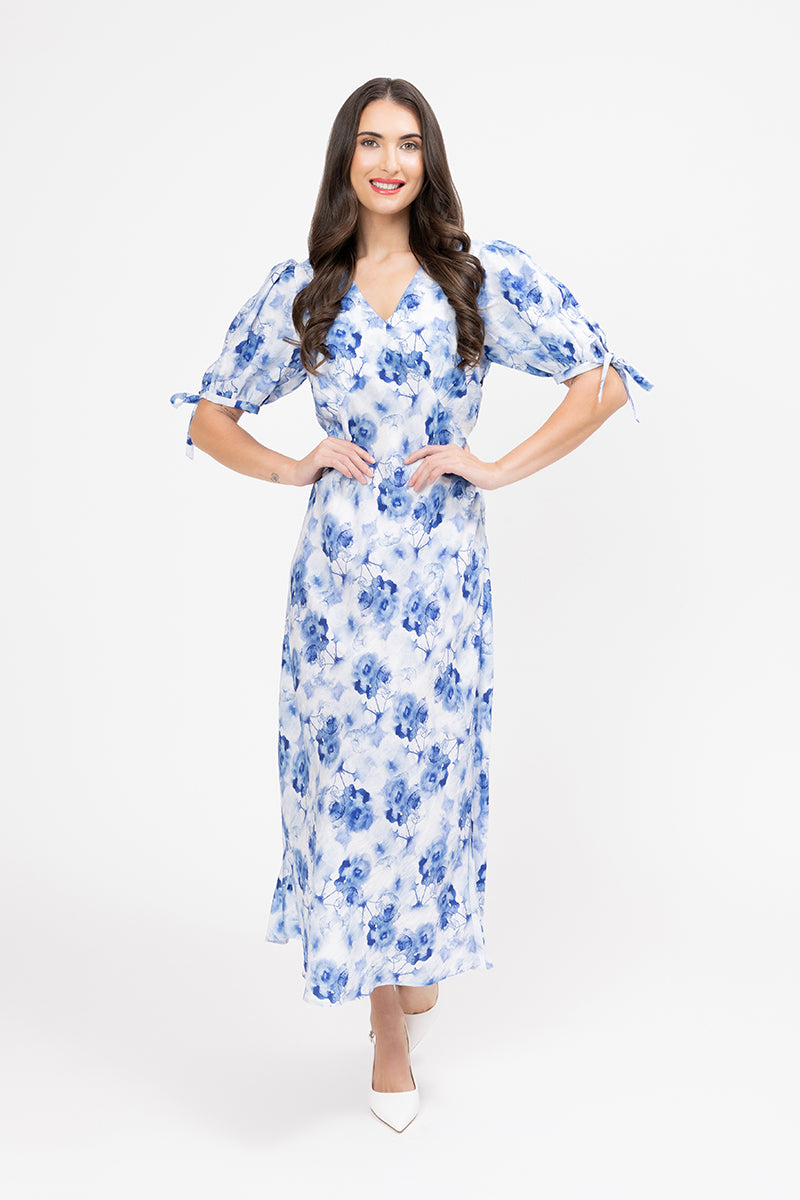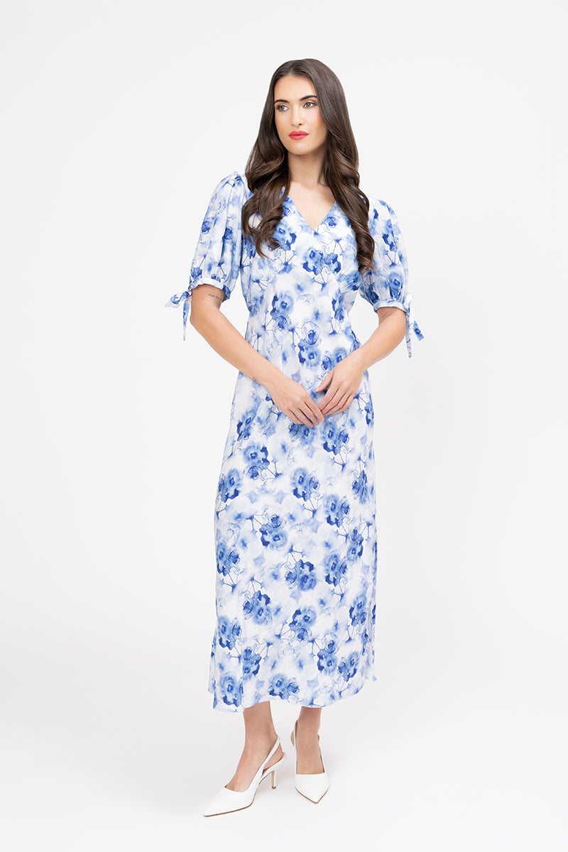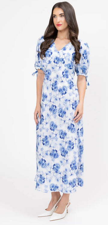 This dress captures the beauty of a watercolour painting with its delicate blue floral print set against a crisp white background. The mid-length maxi cut and graceful silhouette make it a sophisticated and flattering option for any season.