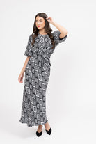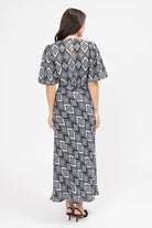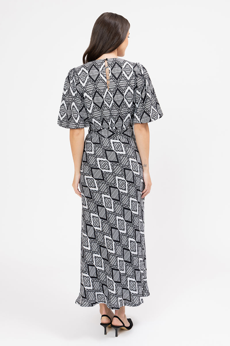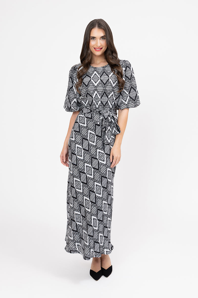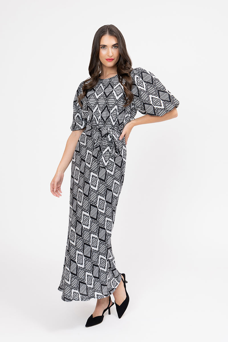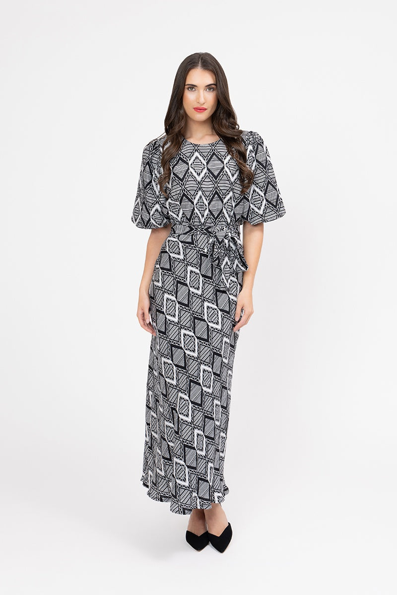 The "Mono Punch" print features a captivating black and white diamond pattern that is both modern and timeless. The dress is designed with a high round neckline, chic short kimono-style sleeves, and a removable waist tie that allows you to cinch the waist for a flattering, customized fit. The maxi length and gentle ruffle at the hem create an effortlessly graceful look.