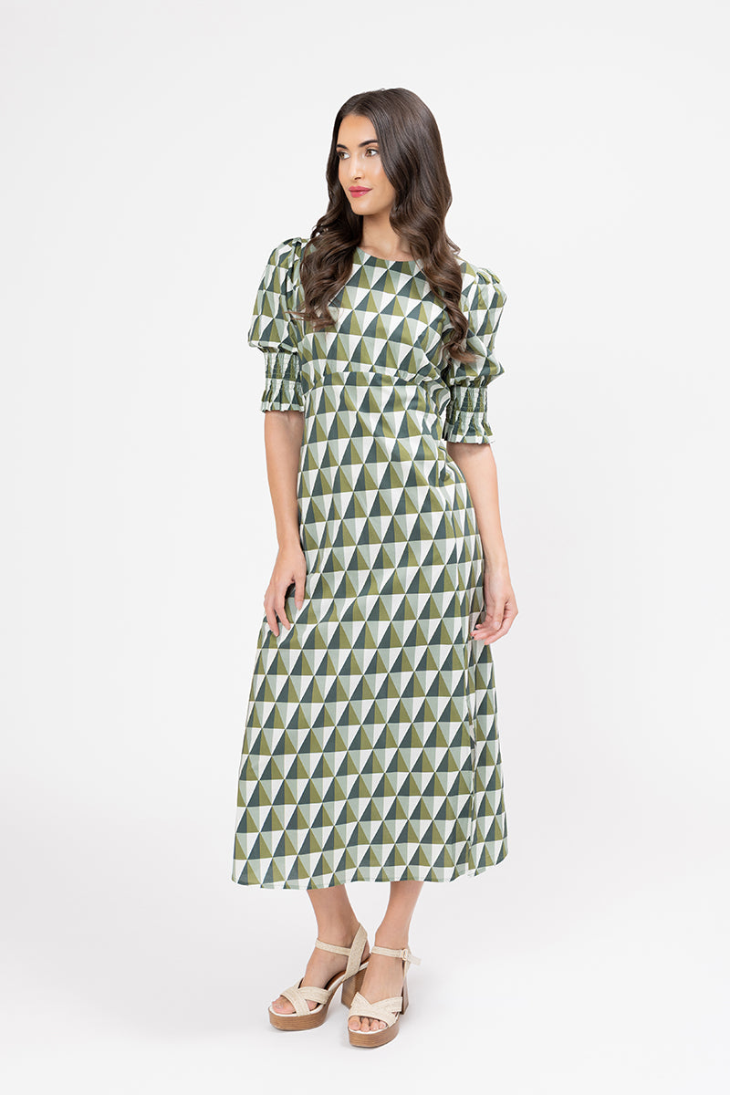 This dress is a true showstopper, featuring an eye-catching geometric pattern of emerald green, olive green, and crisp white triangles. It's a modern and playful print that will have you turning heads wherever you go.