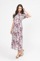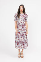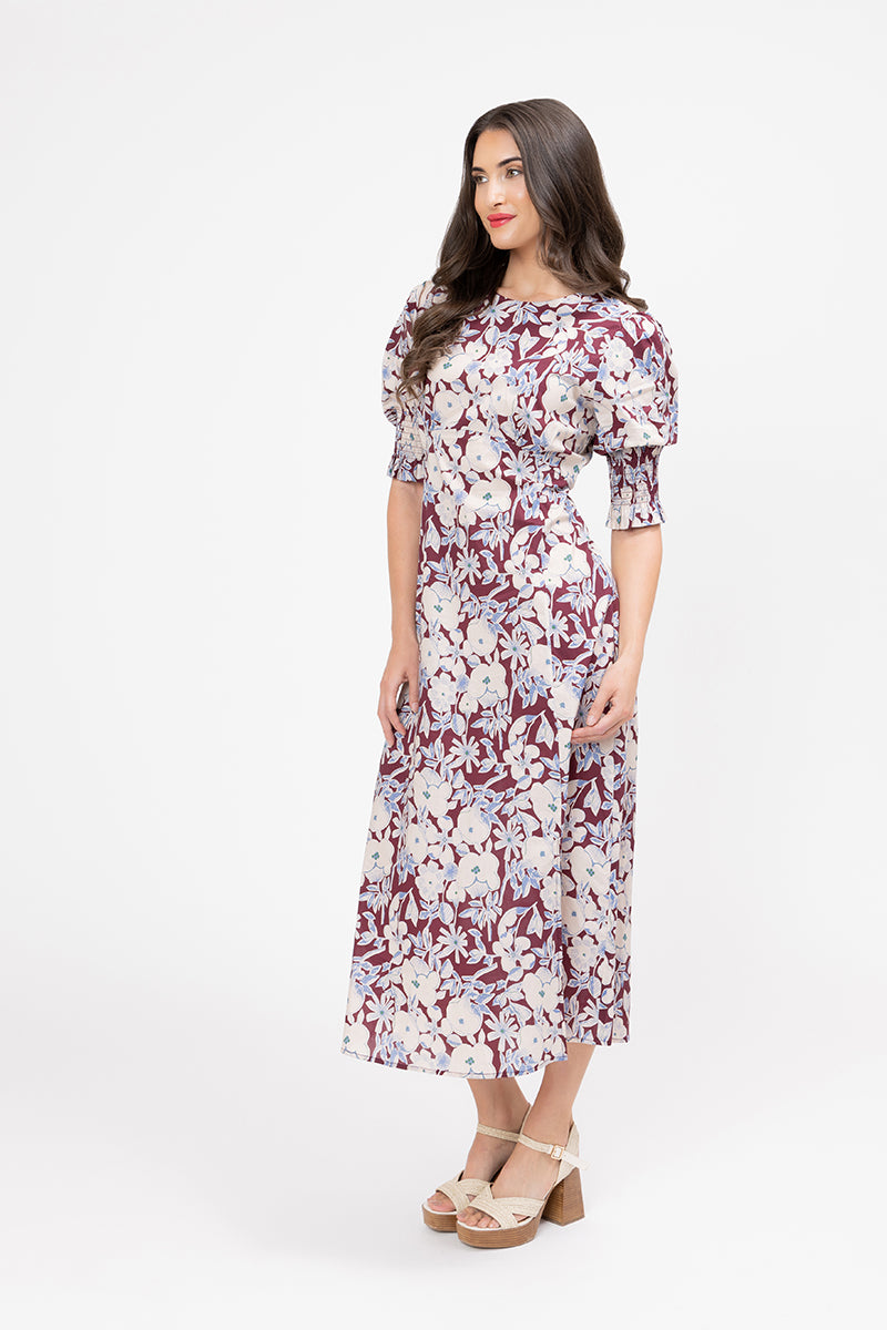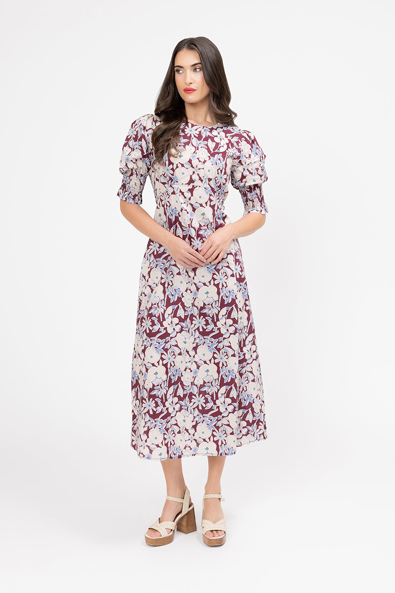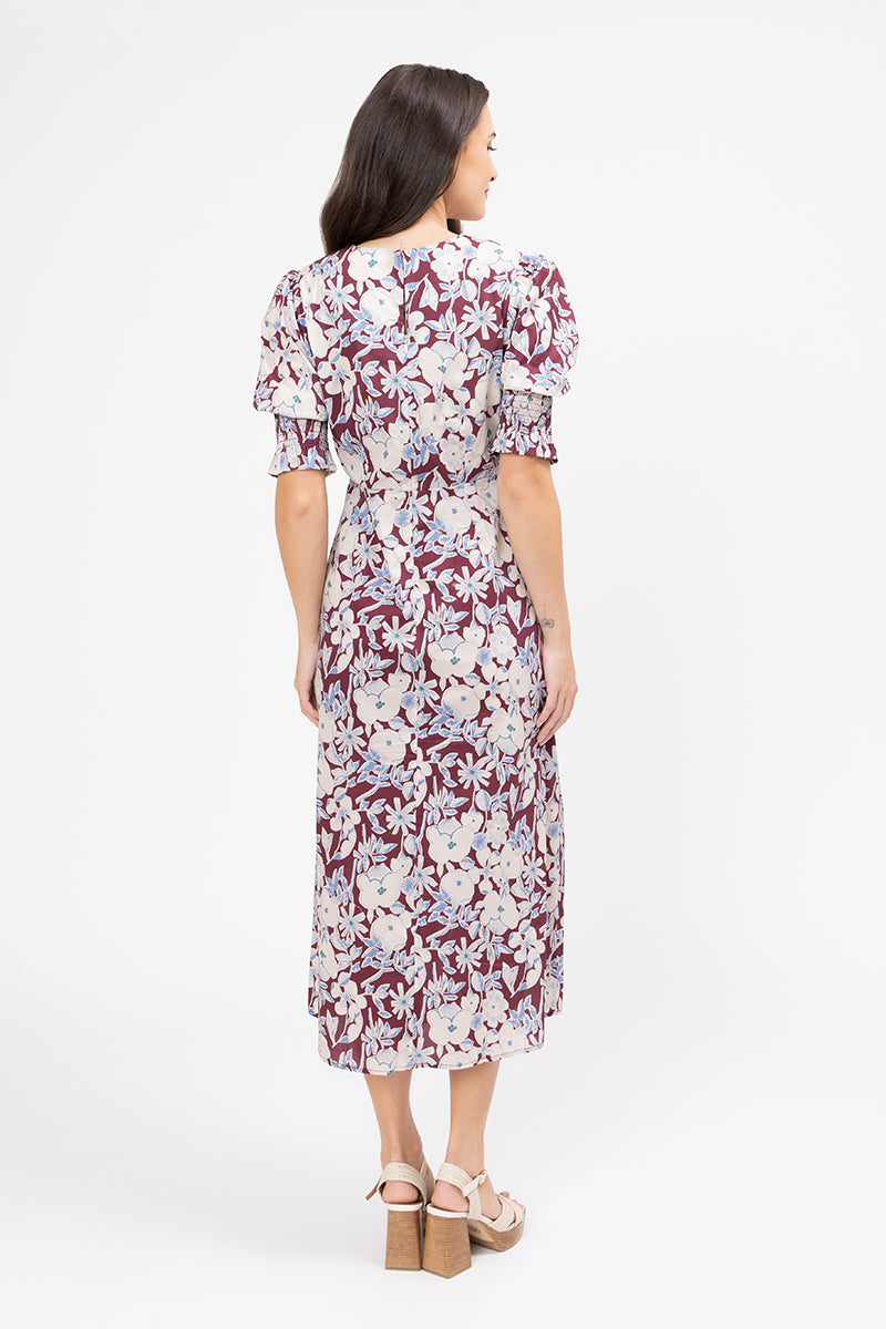 The "Merlot Field" print features a rich, deep red background adorned with delicate floral patterns in shades of cream and light blue. The dress boasts a flattering high neckline, short, voluminous puff sleeves with an elasticated cuff, and a cinched waistline that creates a lovely A-line silhouette. The midi-length skirt with a subtle slit adds a graceful and modern touch.