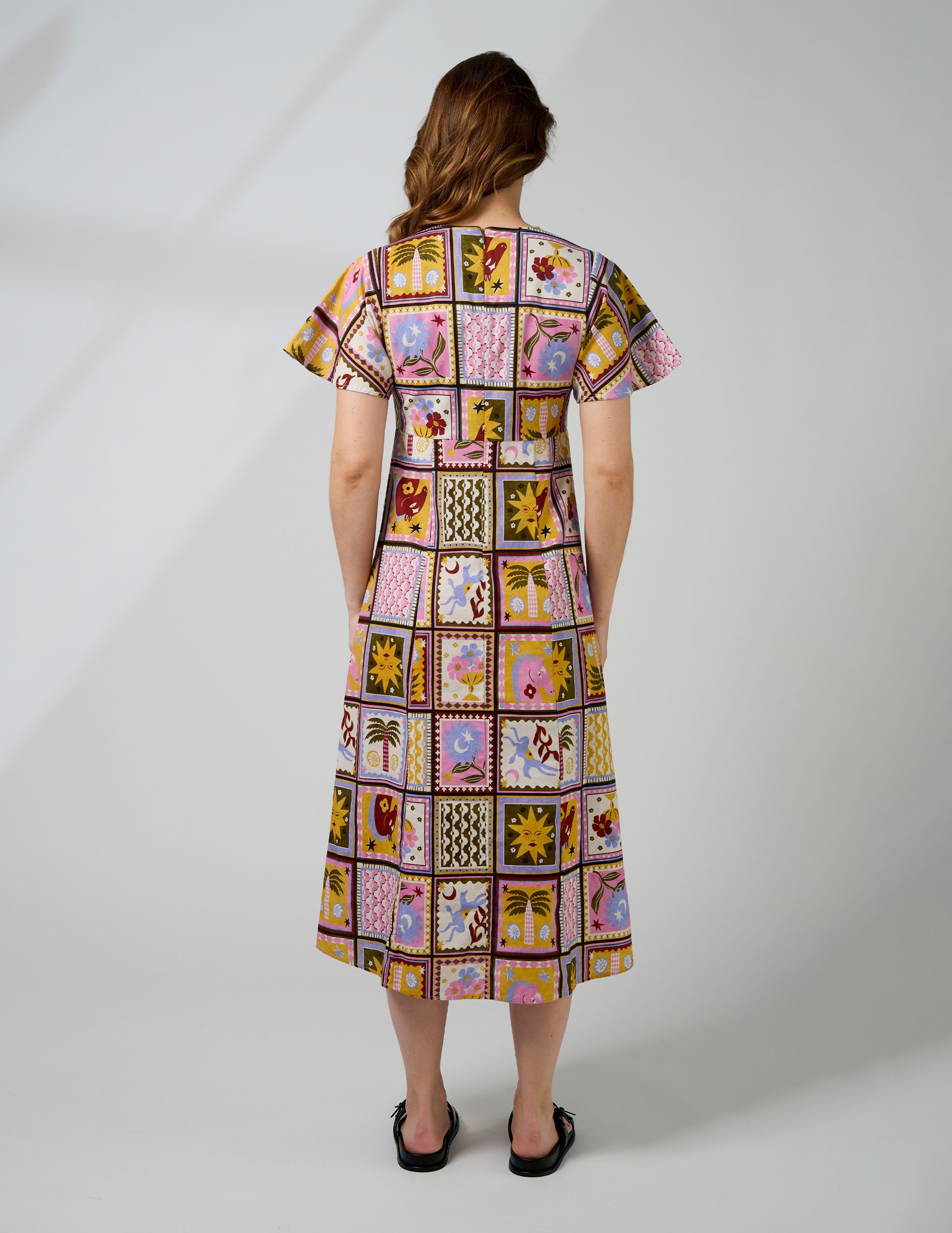 Step into a world of vibrant colour and intricate design with the Stella + Gemma Carlotta Dress in the stunning Memories of Morocco print. This maxi dress is a true statement piece, featuring a mosaic of beautiful, detailed patterns in a palette of pink, gold, green, and cream.