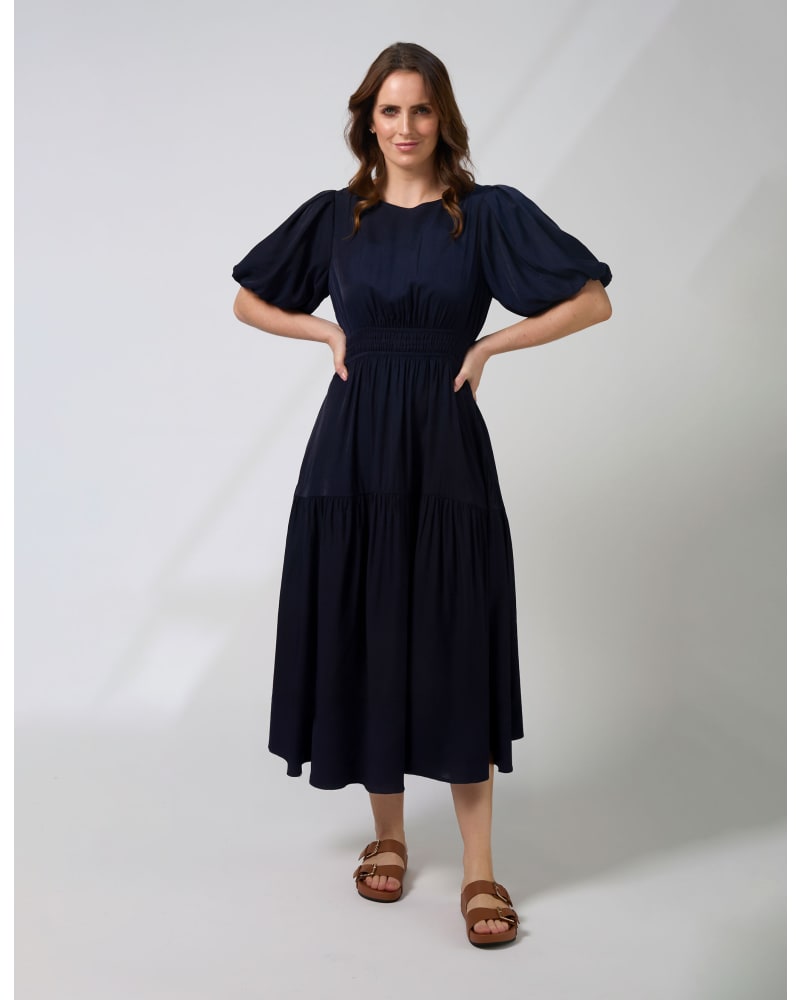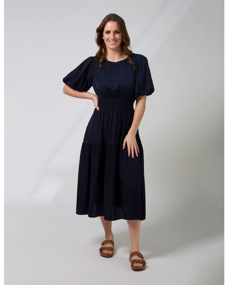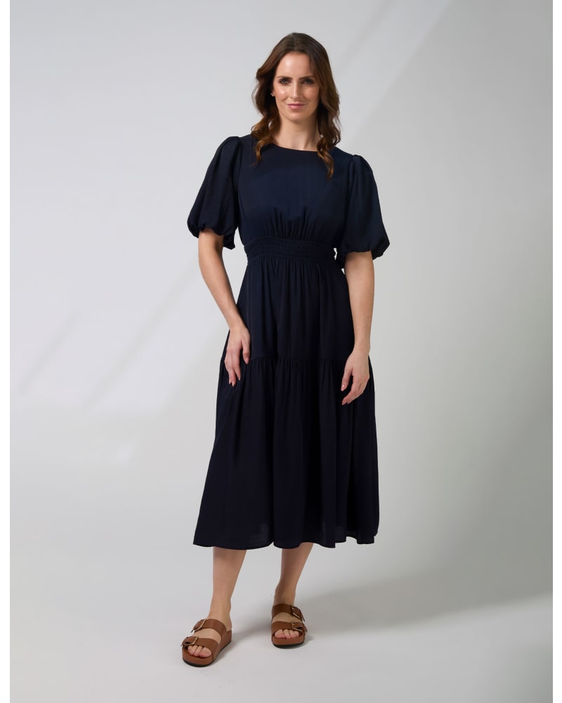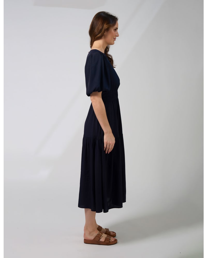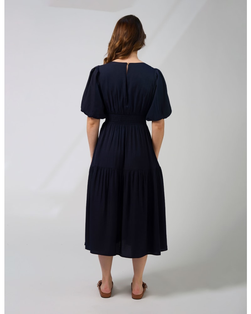 The Stella + Gemma Sabrina Dress in Navy is an elegant and timeless piece that combines comfort with sophisticated style. This midi-length dress is designed to flatter with its tiered silhouette and thoughtful detailing.