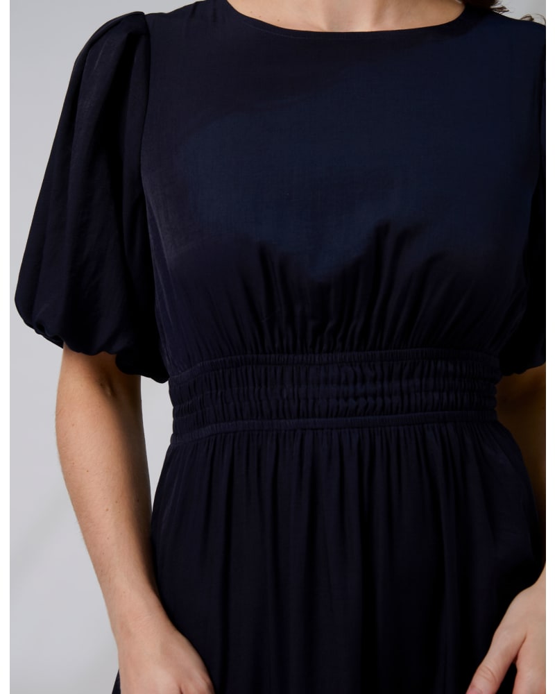 Crafted from a soft and flowing blend of 65% Viscose and 35% Polyester, this dress feels luxurious against the skin and drapes beautifully. It features a fitted upper bodice with intricate elasticated shirring at the waistline that cinches to create a defined and flattering silhouette. The full sleeves with gathered sleeve heads and a bubble hem finish add a touch of romantic volume. A back neck keyhole split with a gold logo button fastening completes the look, adding a hint of subtle glamour.