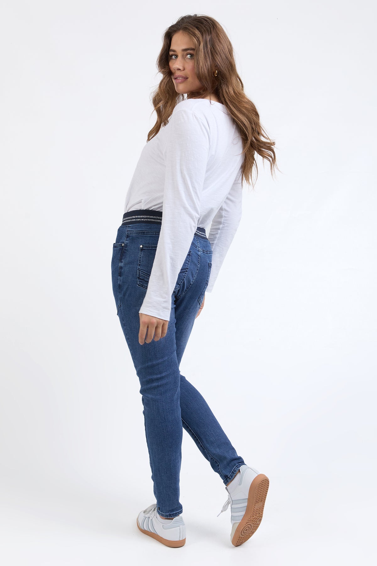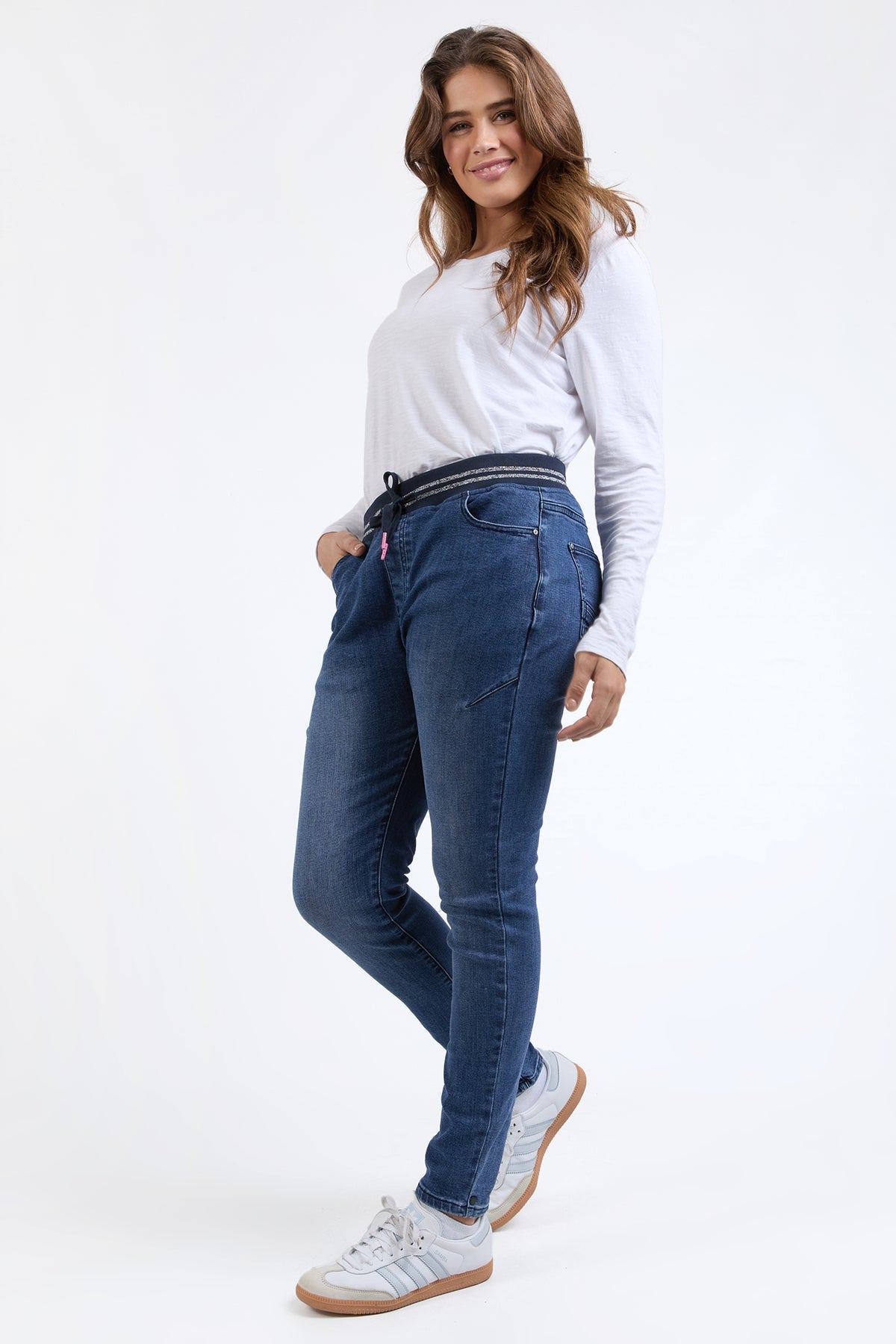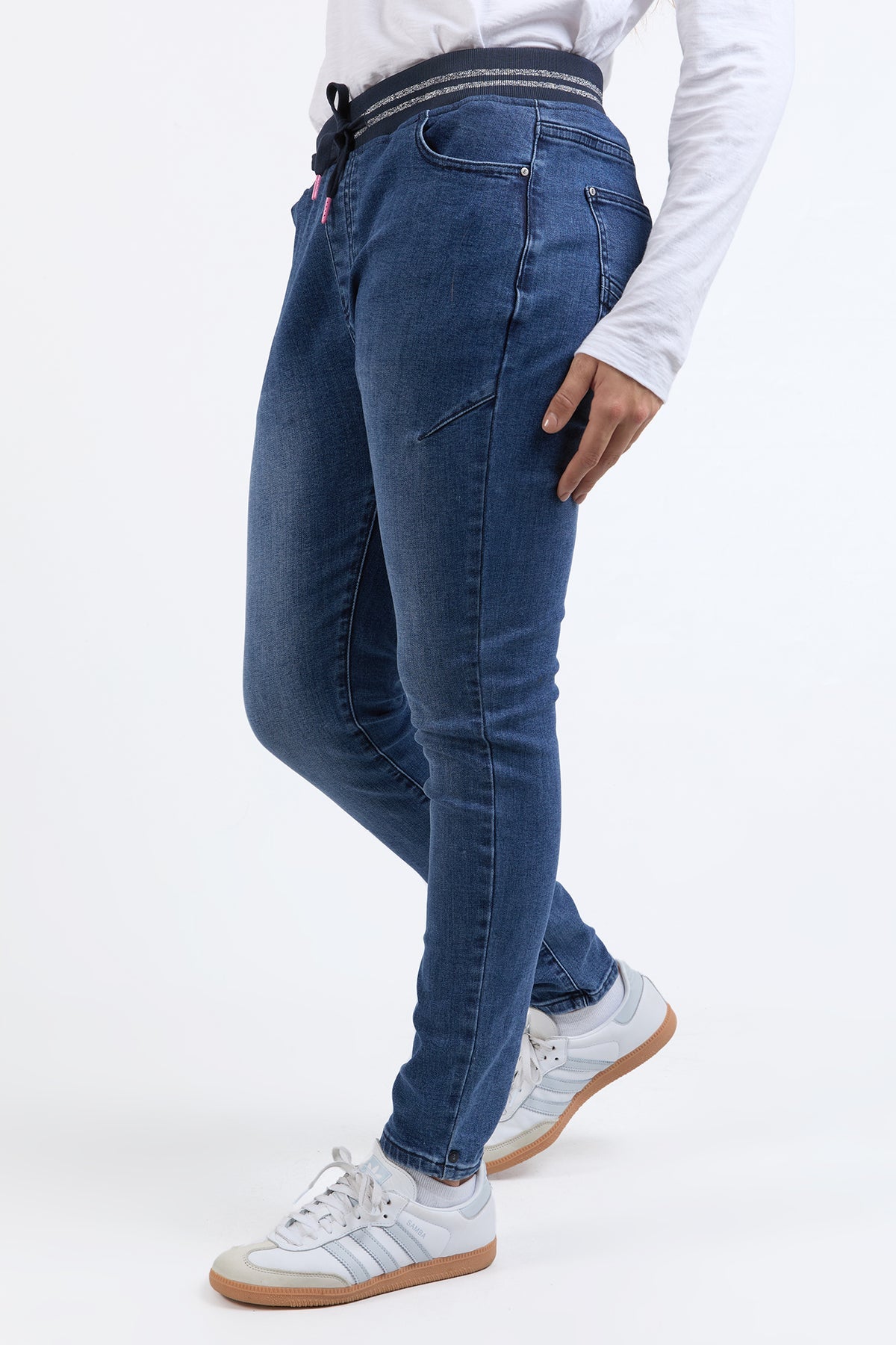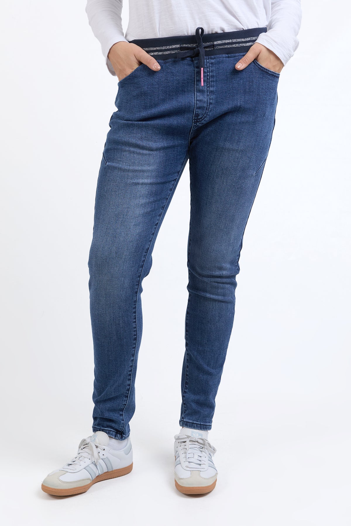 The Melody Denim Jogger are a functional and fantastic stretch pant featuring a slim leg and comfort plus rib waist band with a cute metallic stripe.