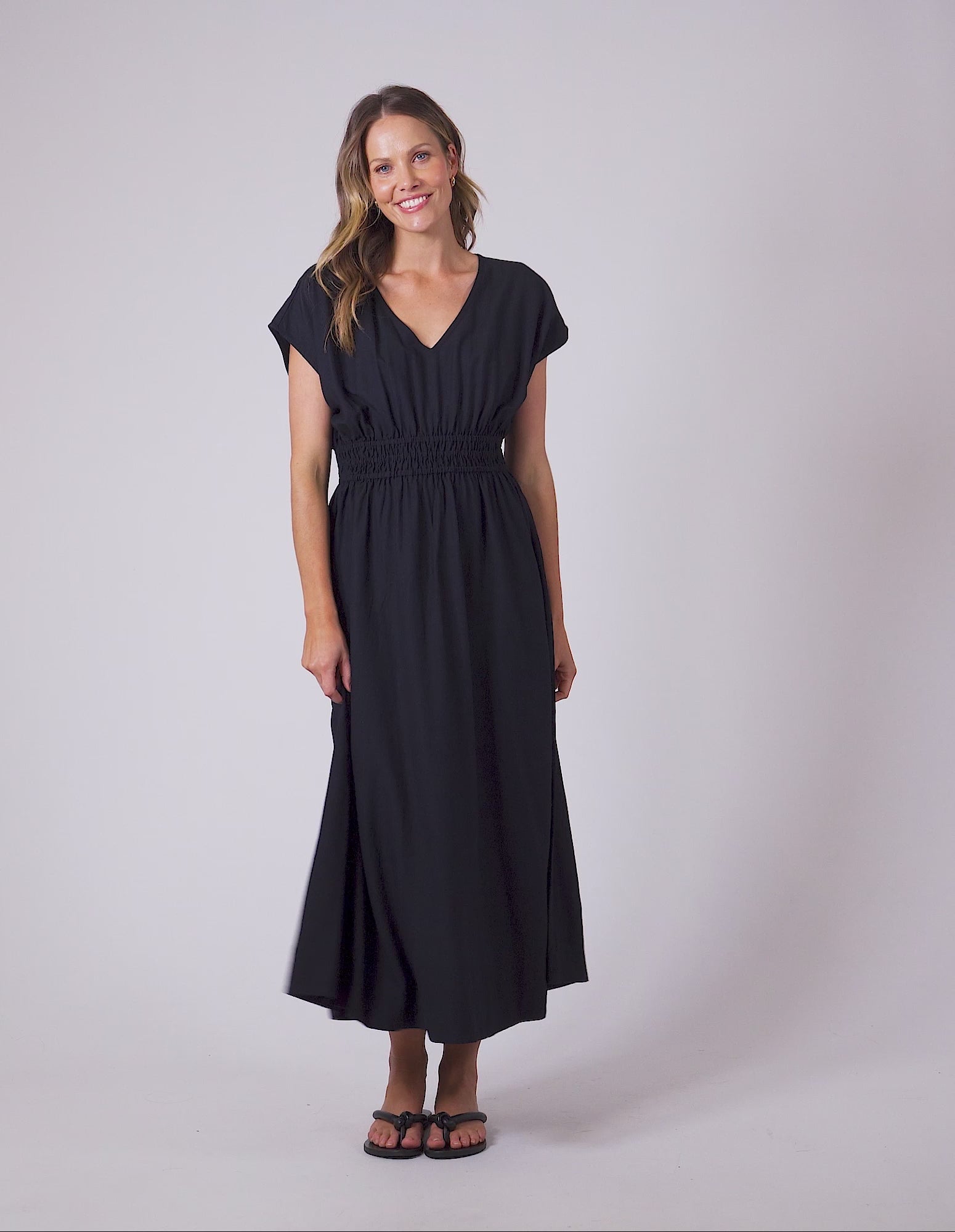 Elevate your effortless dress choice with the new Misty Dress. Featuring a shirred elastic waist for shape and comfort this linen blend midi dress is versatile enough to be worn for any occasion.