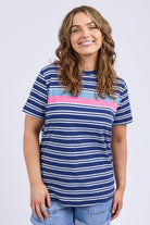 Quintessential Elm Tee featuring colourful stripes in all the hues of the season.