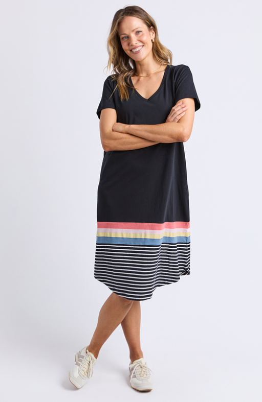 The new terra dress is quintessential Elm style and will be your favourite throw-on-and-go dress this season. featuring a vee neckline, and colour contrast hem panel, this dress looks great with sandals or add your favourite runners for a fresh casual look.