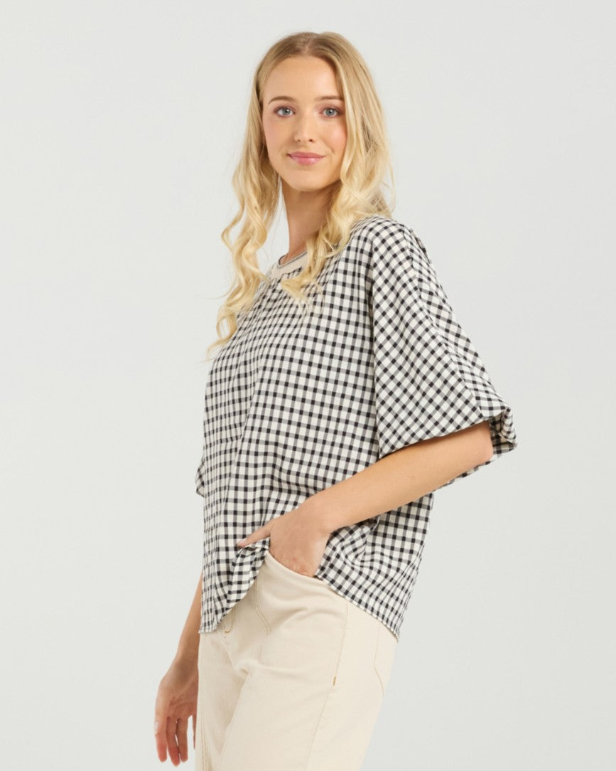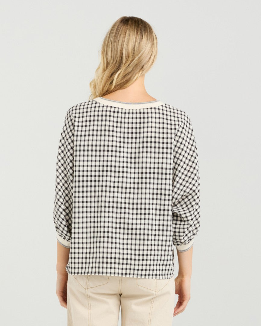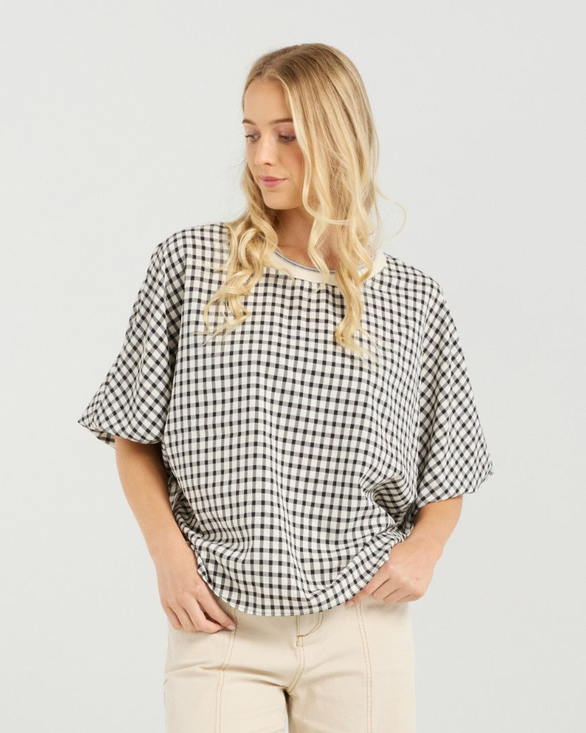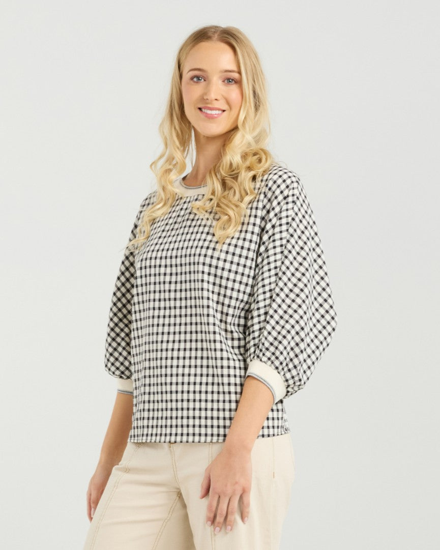 Discover one of our best-selling easy-fit tops, designed for effortless style and this season updated in a cute check fabric, giving it a playful charm. The finishing touches include a striped rib neck and cuffs, adding a luxe finishing touch. Embrace comfort and fashion with this top, a must-have for any wardrobe.