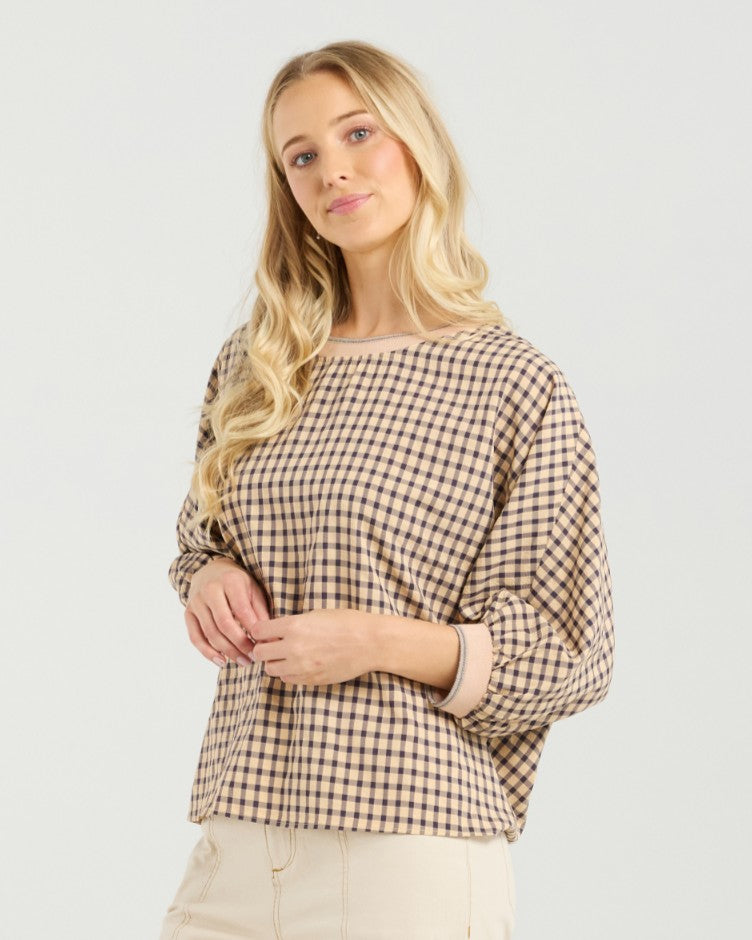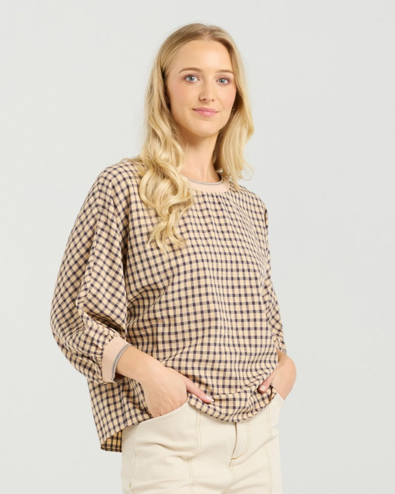 Discover one of our best-selling easy-fit tops, designed for effortless style and this season updated in a cute check fabric, giving it a playful charm. The finishing touches include a striped rib neck and cuffs, adding a luxe finishing touch. Embrace comfort and fashion with this top, a must-have for any wardrobe.