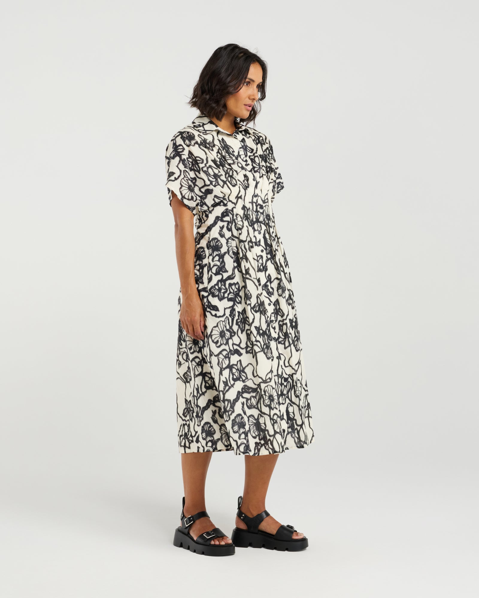 Audrey is an effortlessly chic mid-length dress featuring a classic collared neckline and short sleeves, combining timeless style with everyday ease. The button-down front adds a touch of tailored charm, while delicate pleating at the waist creates a flattering, nipped-in silhouette. Perfect for both casual outings and polished occasions, this dress is a versatile staple for any wardrobe.