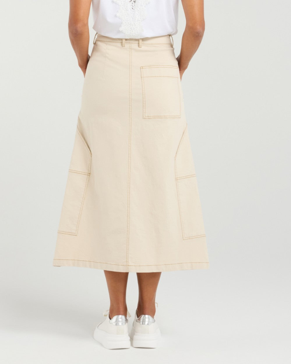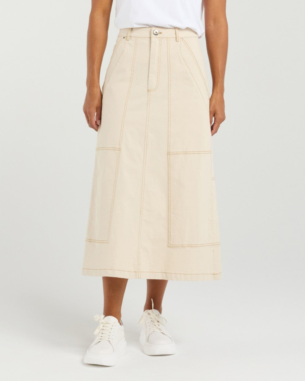 A fresh interpretation of a wardrobe staple, this mid-length A-line skirt channels the spirit of denim in a non-denim fabrication for a lighter, more refined feel. Designed with utility-inspired pockets and contrast stitching, it combines workwear elements with a feminine silhouette. The structured shape and clean finish make it a versatile piece that will become a wardrobe workhorse.