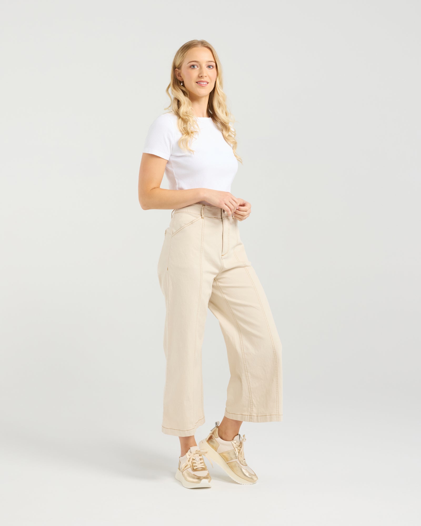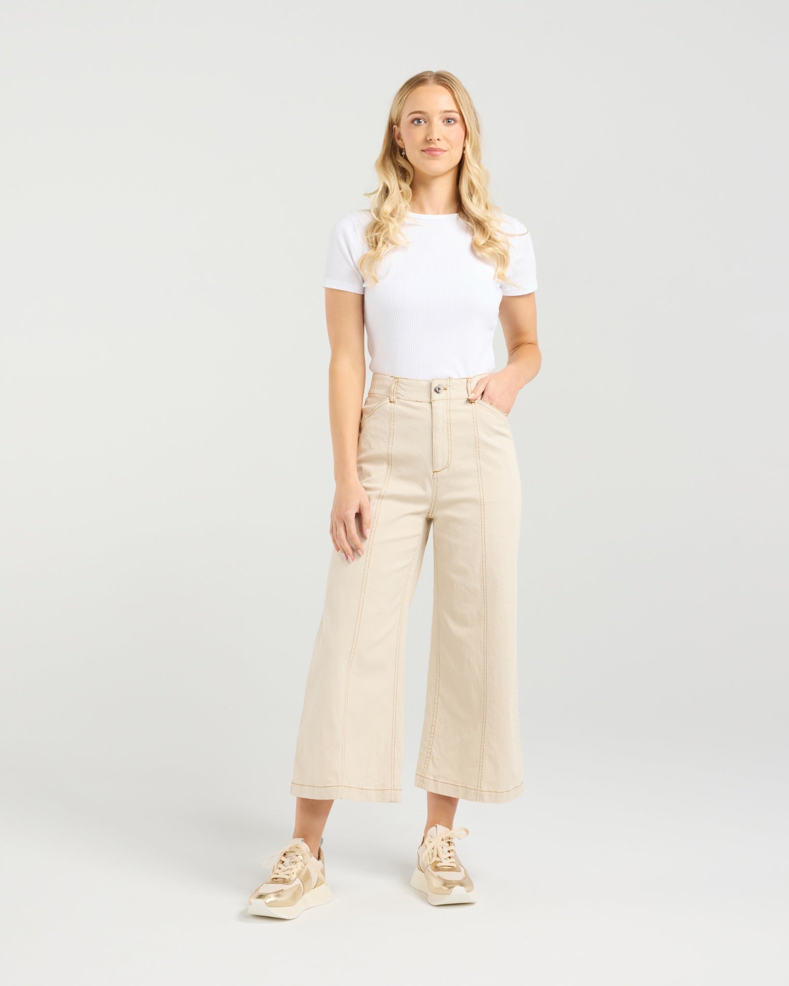 Meet your new non-denim denim crush: these 7/8th wider-legged pants bring major style with a laid-back attitude. Crafted from cotton spandex blend, they feature contrast stitching for that finishing touch. The cropped length shows off your shoes, while the wide leg keeps things effortlessly chic. Perfect for dressing up or kicking back!