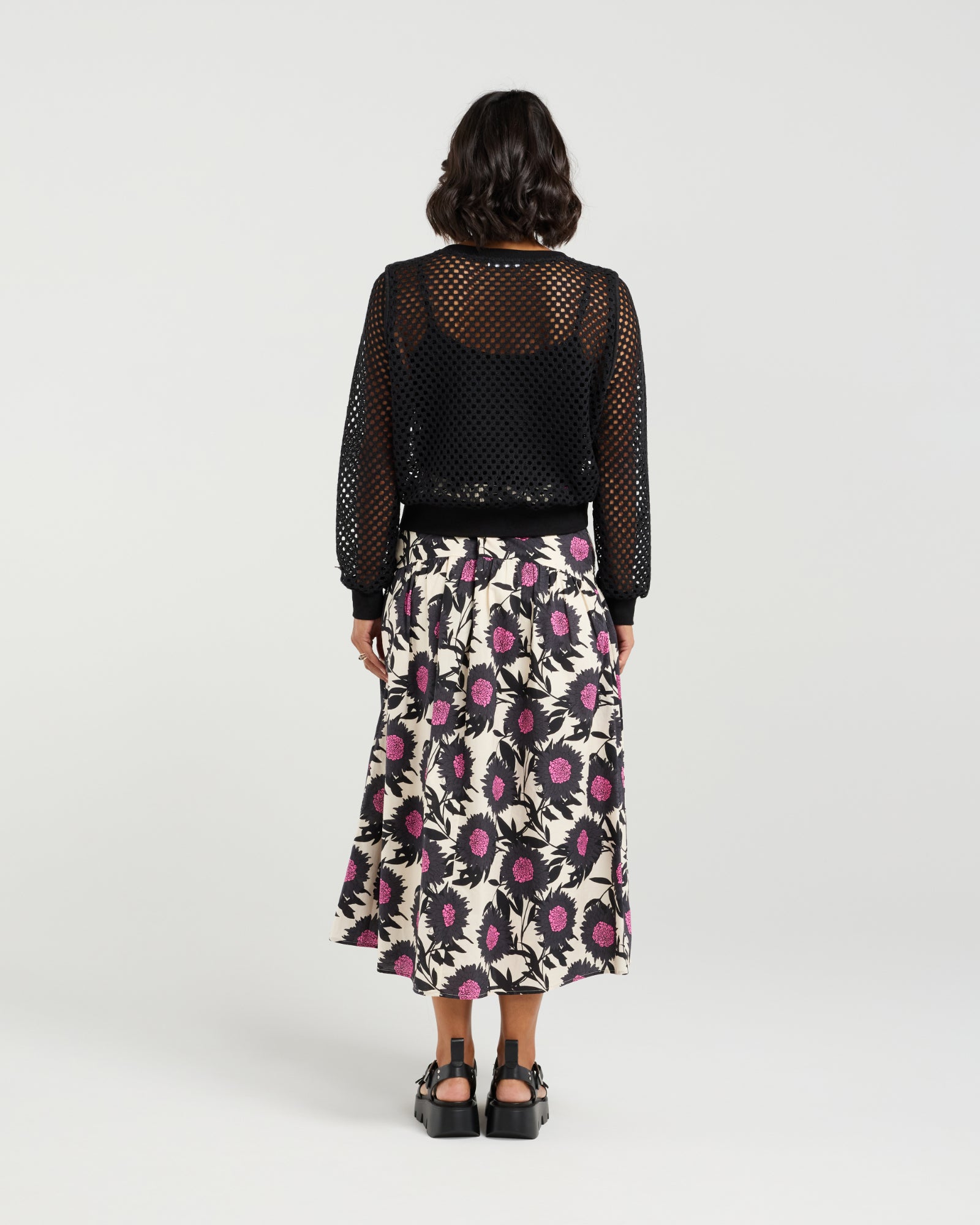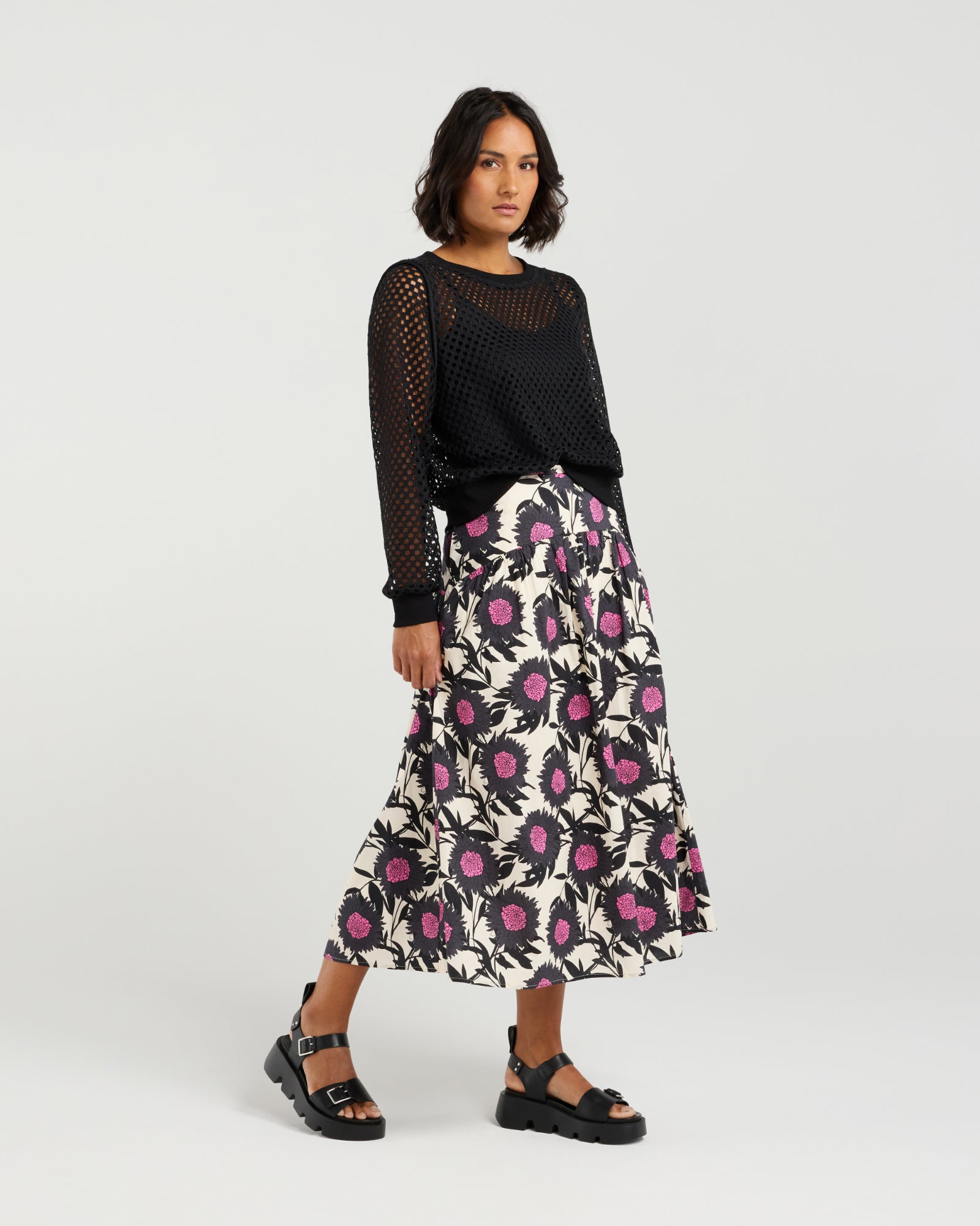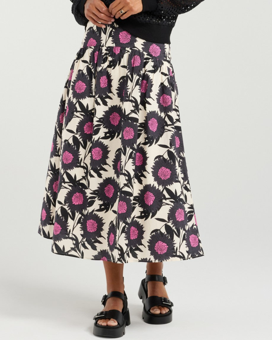 Twirl-worthy and totally flattering, this mid-length gathered skirt is all about easy elegance. The wide waistband smooths across the stomach for a comfy, cinched-in look, while hidden pockets add a touch of practical magic. Dress it up or keep it casual—this skirt is ready to go wherever your day takes you!