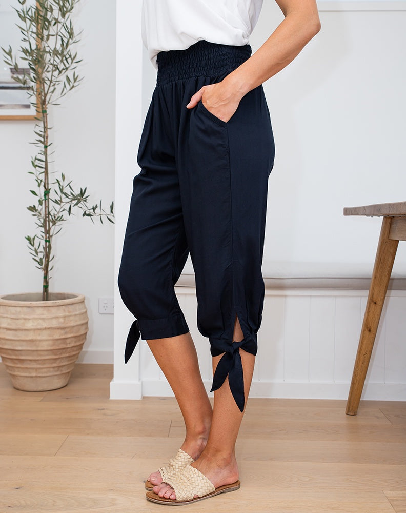 These Navy, simple yet stylish 3/4 length pants are perfect for summer. A comfortable and easy wearing style that can be worn from day to night to a variety of occasions. Change the look from casual flats and a basic tee to wedges and a stylish top!