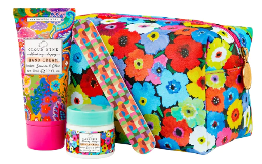 Primp your hands and feel happy too with this set of three manicure essentials of hand cream, cuticle cream and colourful nail file in a cheering floral print make-up bag.