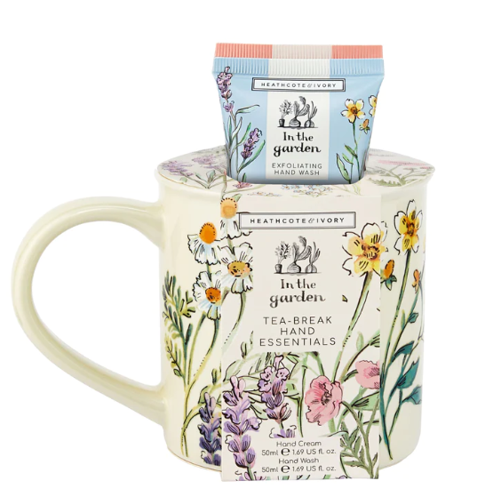 Our colourful self-care gift of ceramic mug brimming with rhubarb scented hand wash and shea butter hand cream: perfect for a gardener’s well-deserved tea break.