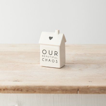 A simple yet stylish porcelain house decoration with "our beautiful chaos" message and cute heart motif.