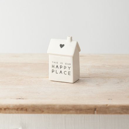 A simple yet stylish porcelain house decoration with "this is our happy place" message and cute heart motif.