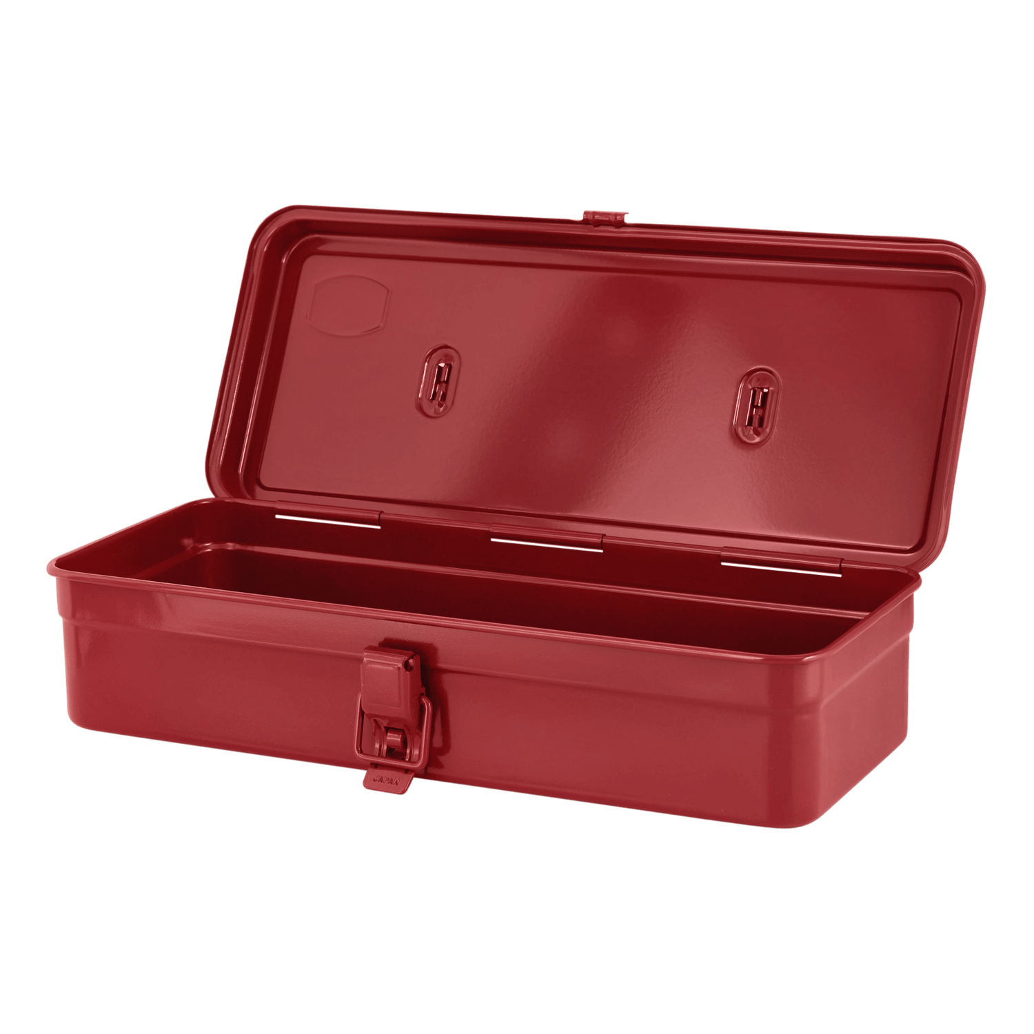 Toyo's trunk-type toolbox is a beautiful intersection of form and function. Flat-topped with a comfortable rounded handle, it latches securely and can be locked shut with a 4mm padlock.