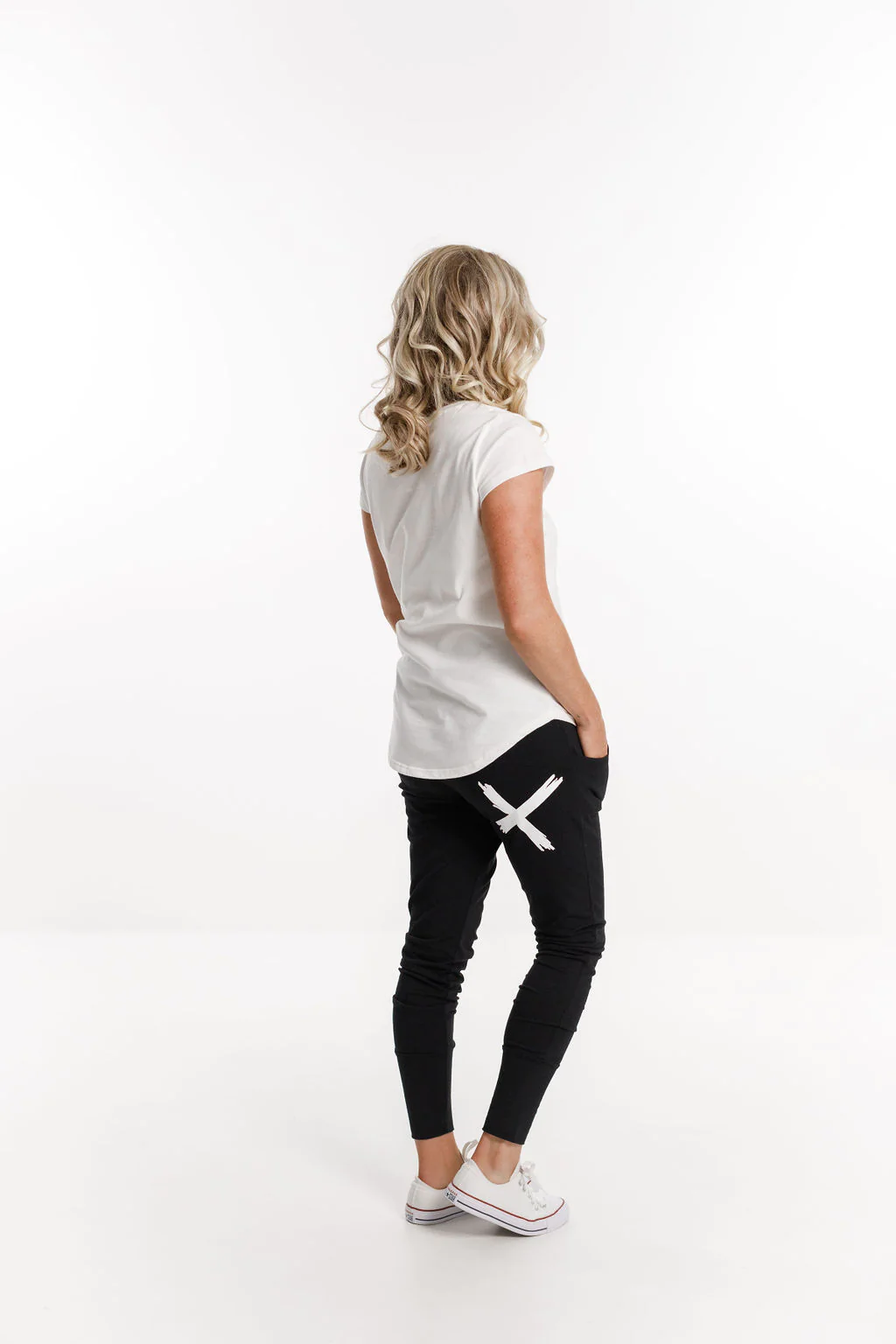 Can be worn as drop crotch, or standard normal fit (worn higher). Has pockets, and wide ribbed cuffs