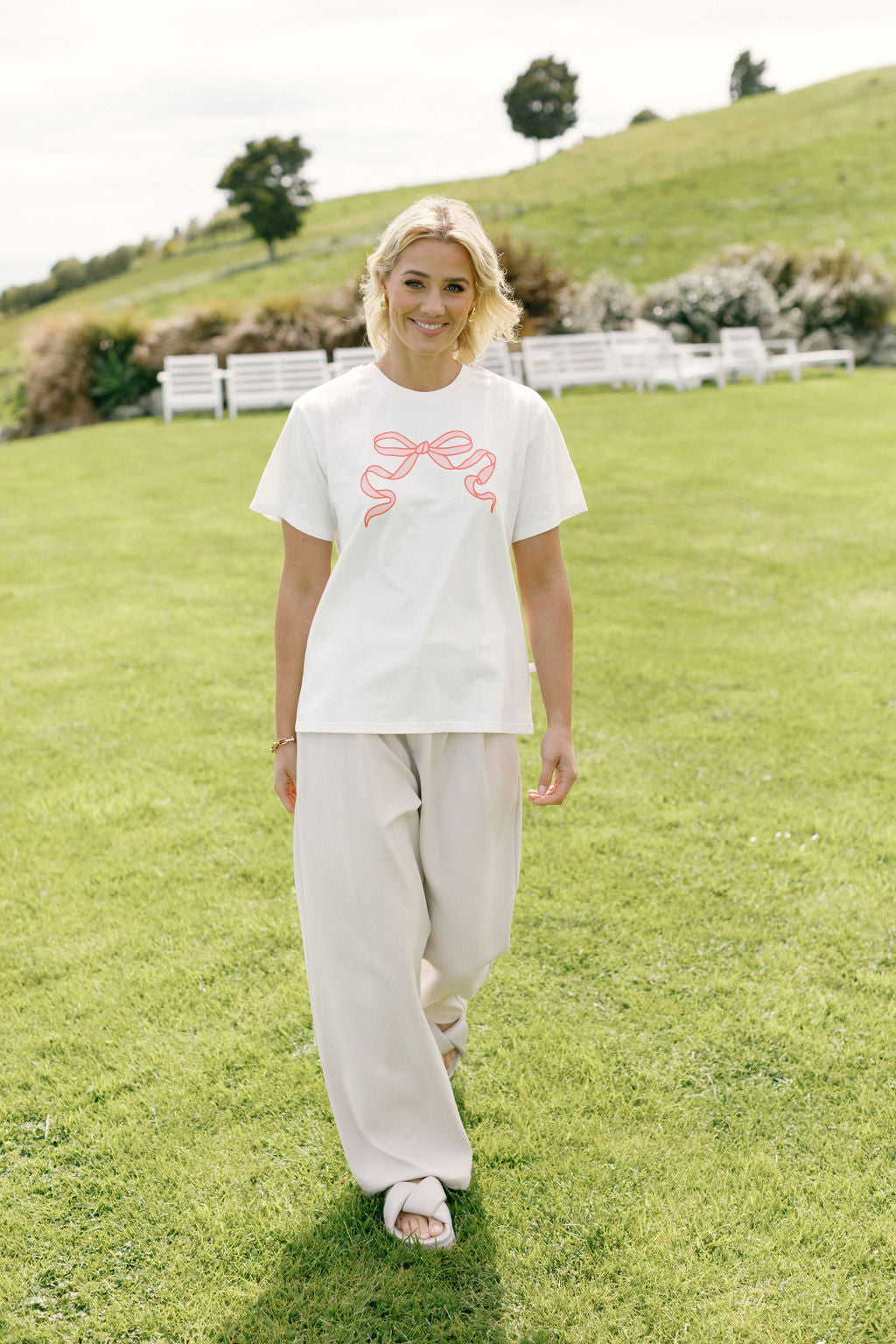 Whether you’re pairing it with jeans, shorts, or skirts, the Chris Tee brings a playful, feminine twist to your casual wardrobe.