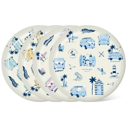 A 4 set of reusable picnic plates in a Volkswagen camper design. Each plate is covered in boho coastal images. Great for when eating outdoors!