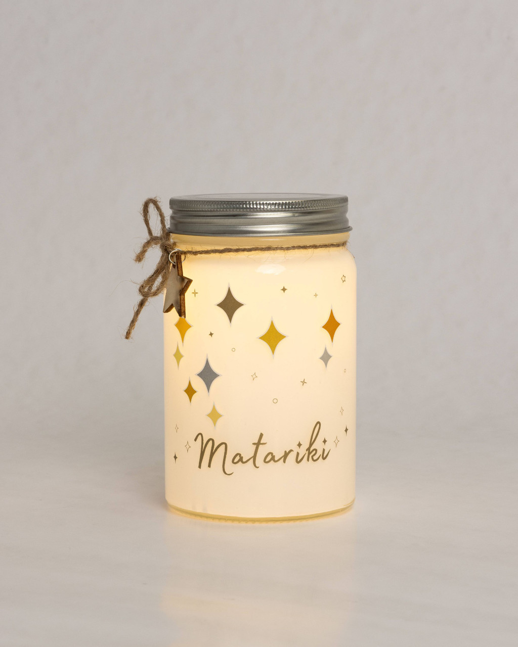 The jars are white with gold printing of Matariki and 9 twinkle stars.