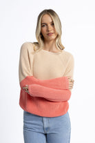 Crafted from 100% soft cotton with stretch, this knit is breathable and comfortable for all-day wear. It features a modern raglan sleeve with a contrast knit detail and a block colour design, with a soft latte tone on the upper half and a vibrant coral on the lower half. The ribbed neckline, hem, and sleeve cuffs provide a classic and comfortable fit.