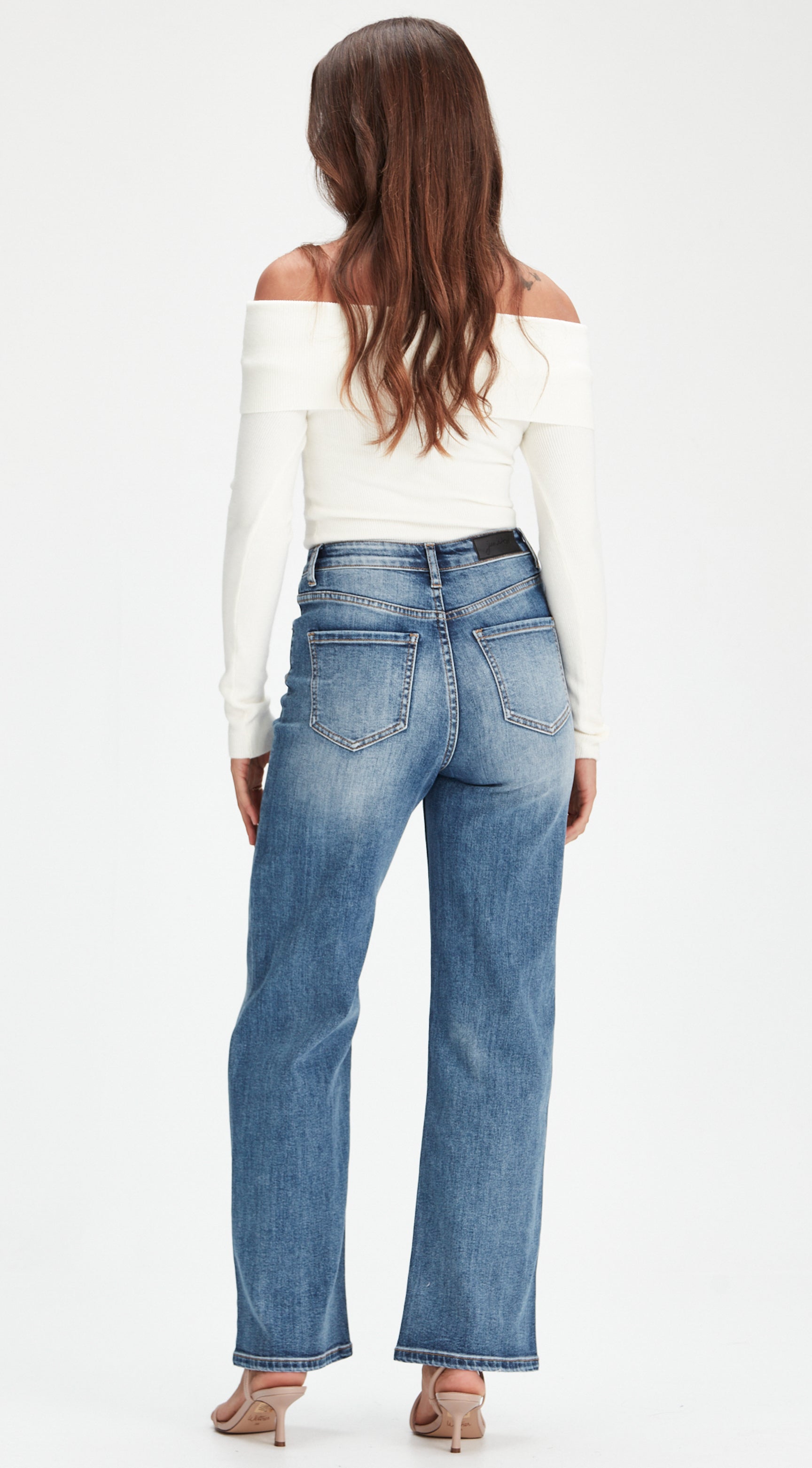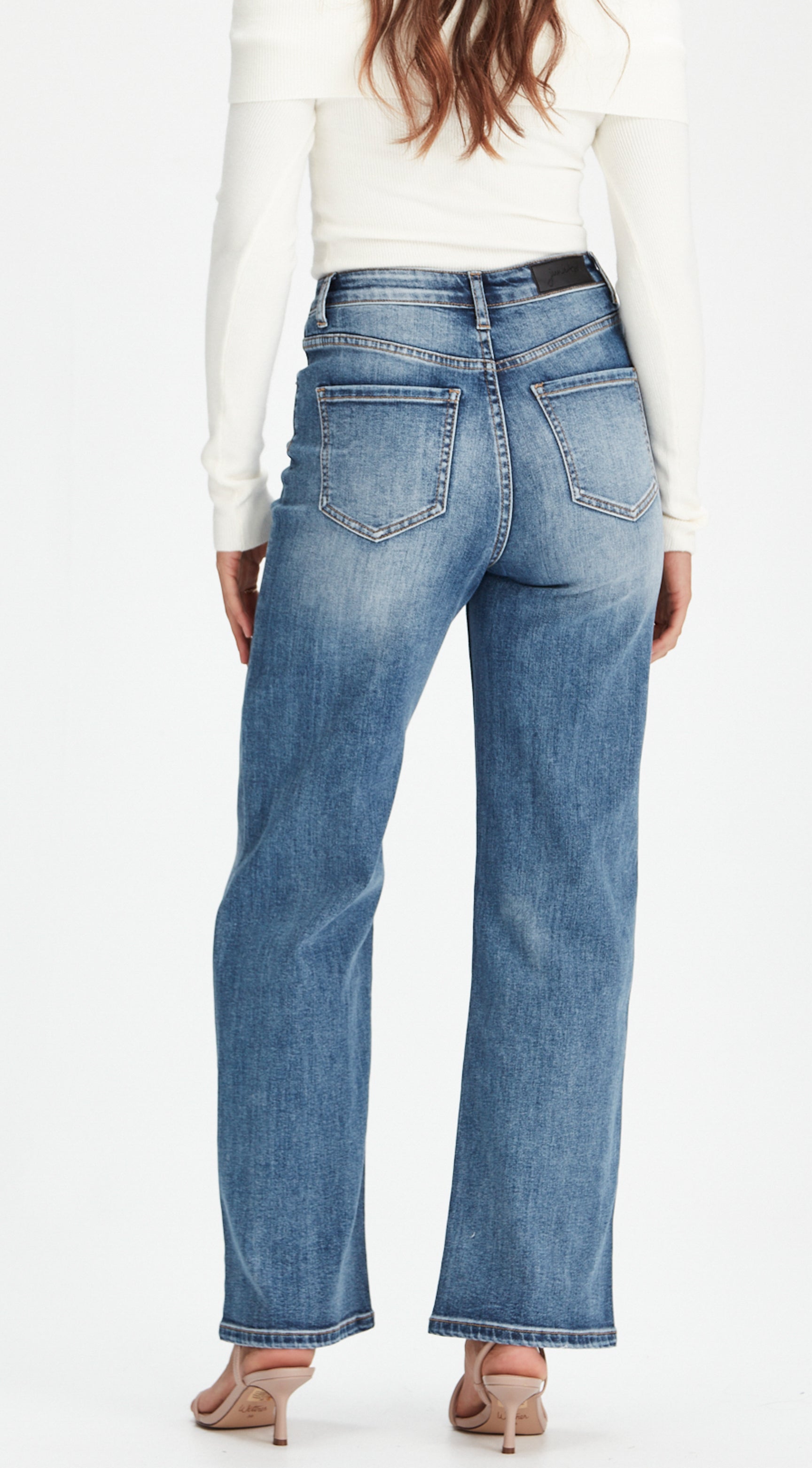 Mid to high-waisted wide leg jean
