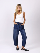 Characteristics of Leo Barrel-Leg Jeans include a fitted waist, flared-out shape around the mid-leg, and tapered silhouette at the bottom, which exudes the look of, well, a barrel. It's the vibe of a cowboy ready for a showdown in the Wild, Wild West!!!