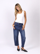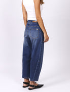 Characteristics of Toni Barrel-Leg Jeans include a fitted waist, flared-out shape around the mid-leg, and tapered silhouette at the bottom, which exudes the look of, well, a barrel.