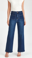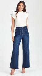 Mid to high waisted, stretch denim, wide leg jean with front pocket design.